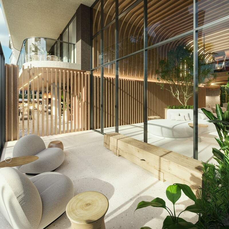 Apartamentos com 125,24m² a 150,31m² possuindo dois quartos sendo um suíte, sala de estar/jantar, banheiro social, cozinha com área de serviço integrada, fechadura digital e varanda gourmet.