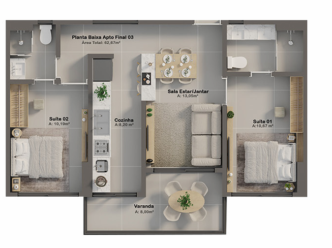 Este imóvel foi pensado para quem valoriza bem-estar e espaço. Conta com sala ampla para dois ambientes, varanda, dois quartos, sendo duas suítes, além de cozinha separada da área de serviço, trazendo mais praticidade para o dia a dia. Um apartamento completo, ideal para quem deseja unir comodidade, funcionalidade e o privilégio de morar perto do mar.