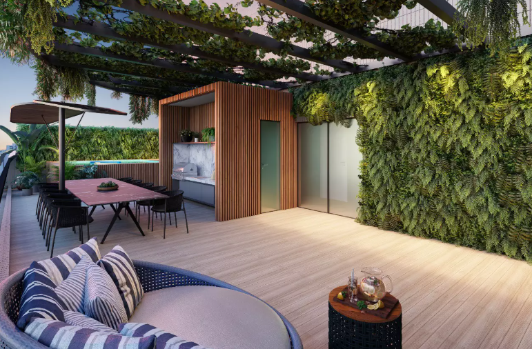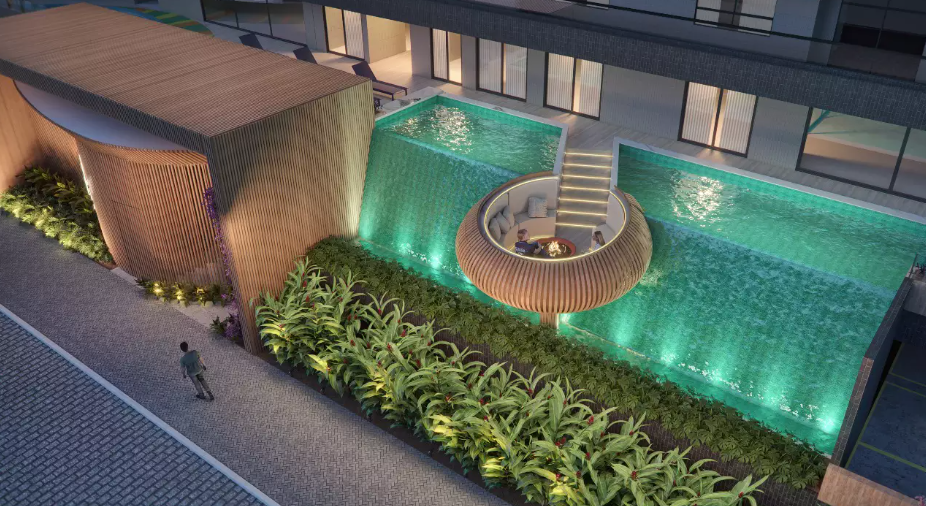 > Área de lazer com piscina, churrasqueira, espaço gourmet, hidromassagem, sala de massagem e sauna;