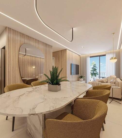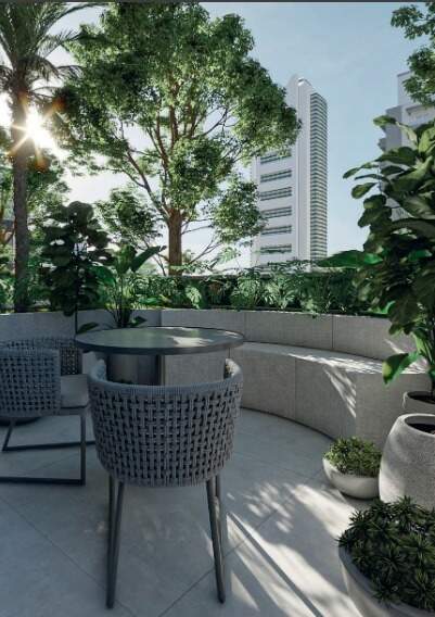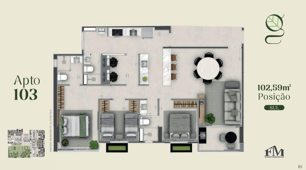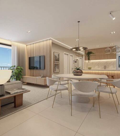 Apartamentos com 102,59m² possuindo três quartos, sendo duas suítes, sala de estar/jantar, banheiro social, escritório, cozinha com área de serviço integrada e varanda gourmet.