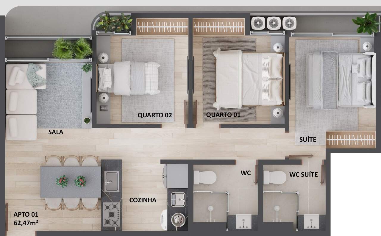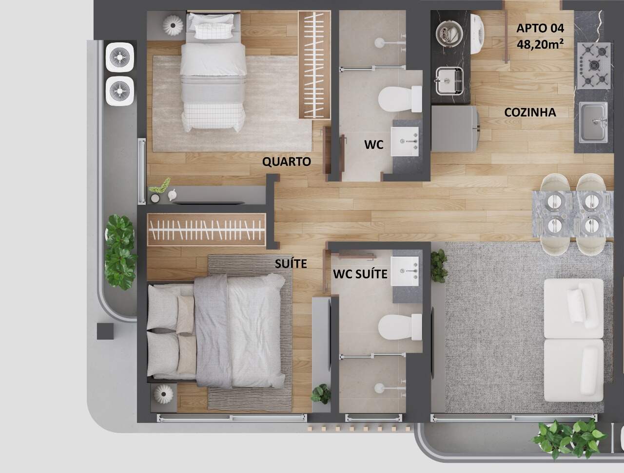 Apartamentos com 48m² a 61m² possuindo dois quartos sendo um suíte, sala de estar/jantar, banheiro social, cozinha com área de serviço integrada.