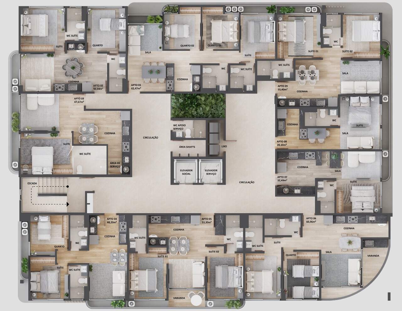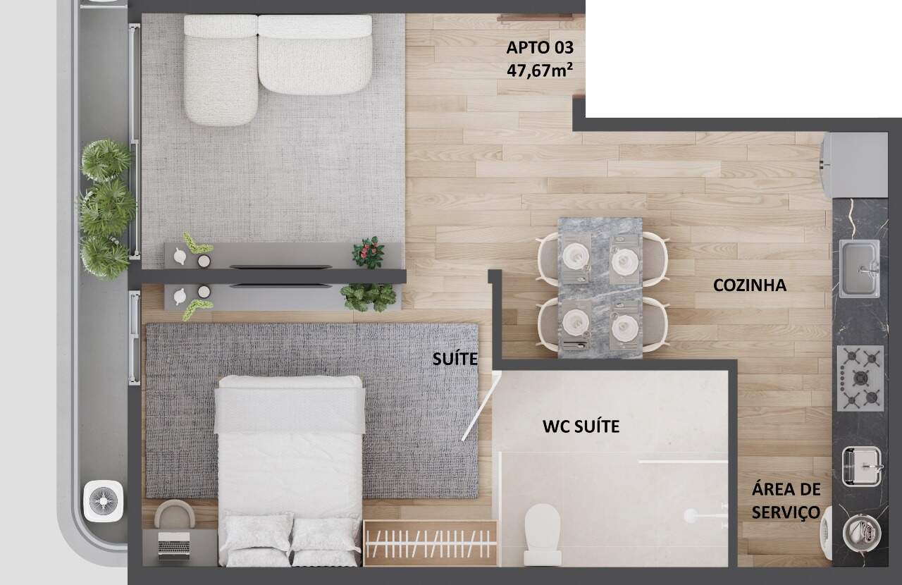 Com opções de plantas diferentes, sendo; Apartamentos com 46m² a 47m² possuindo um quarto, banheiro social, sala de estar/jantar e cozinha com área de serviço integrada.