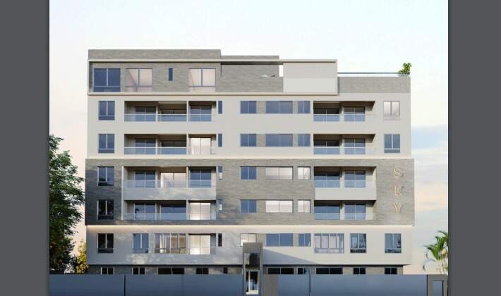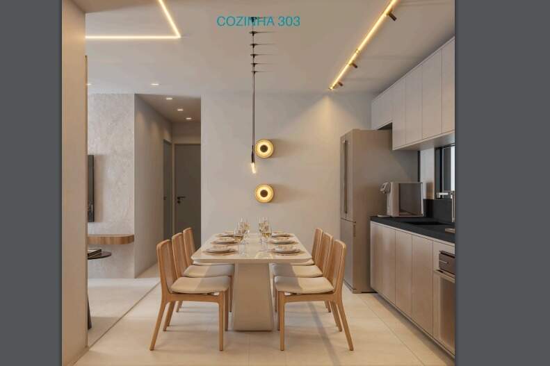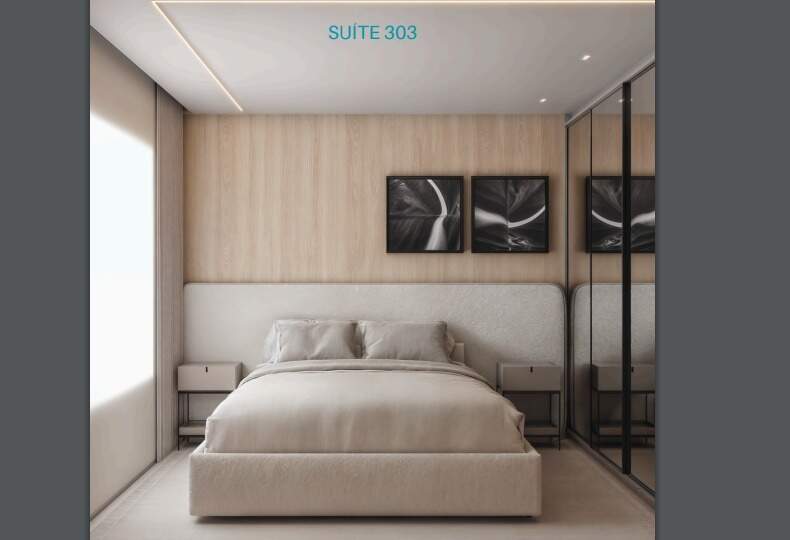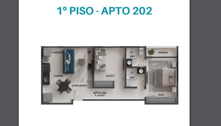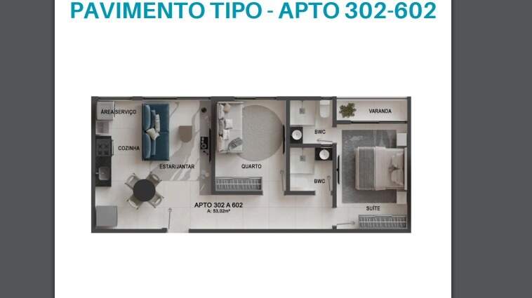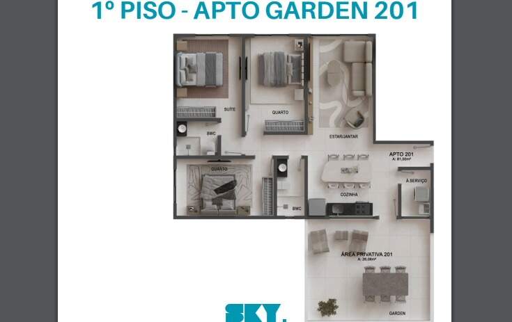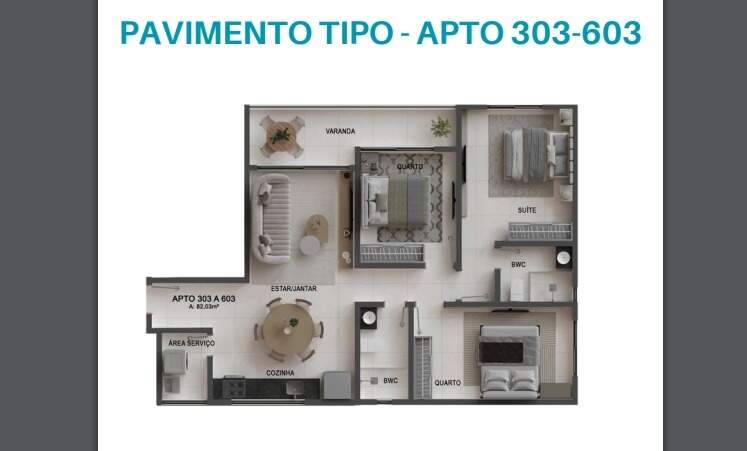 Apartamentos com 81,03m² a 82,03m² possuindo três quartos sendo um suíte, sala de estar/jantar, banheiro social, cozinha com área de serviço integrada.