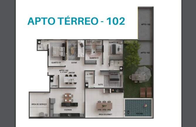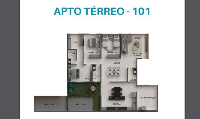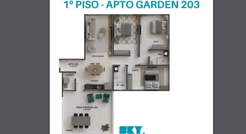 Com opções de plantas diferentes, sendo; Apartamentos garden com 107,43m² a 141,05m² possuindo até dois quartos, sendo um suíte, banheiro social, sala de estar/jantar e cozinha com área de serviço integrada e área privativa.