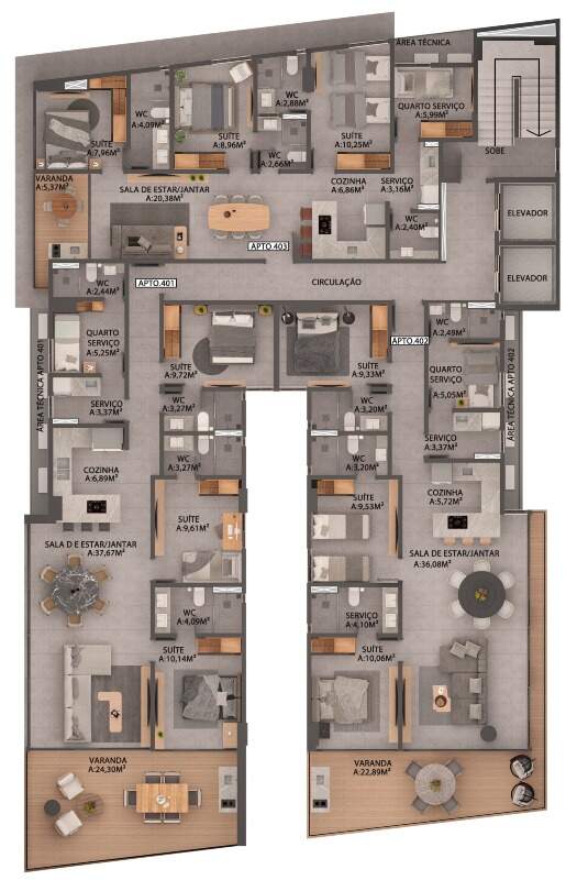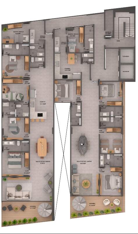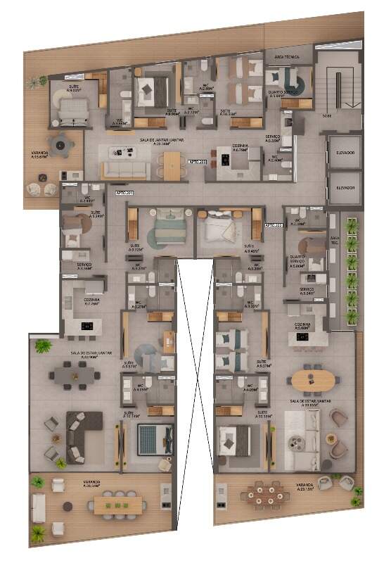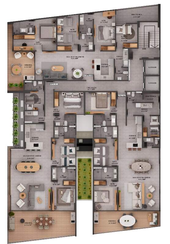 Com opções de plantas diferentes, sendo; Apartamentos com 95m² a 154m² possuindo três quartos, banheiro social, sala de estar/jantar e cozinha com área de serviço integrada, DCE e varanda.