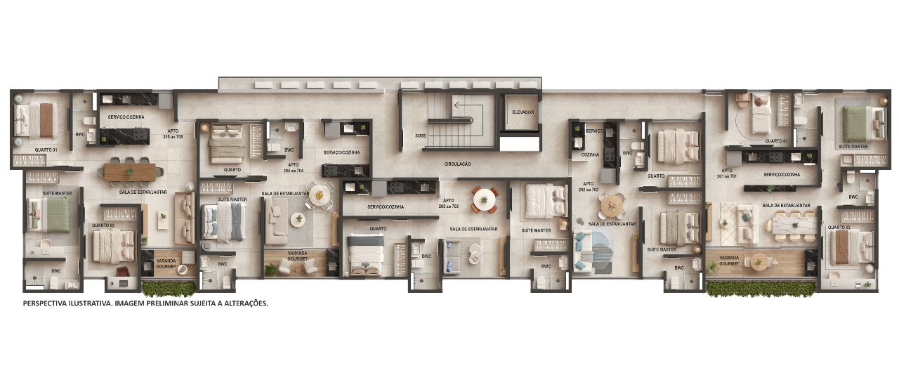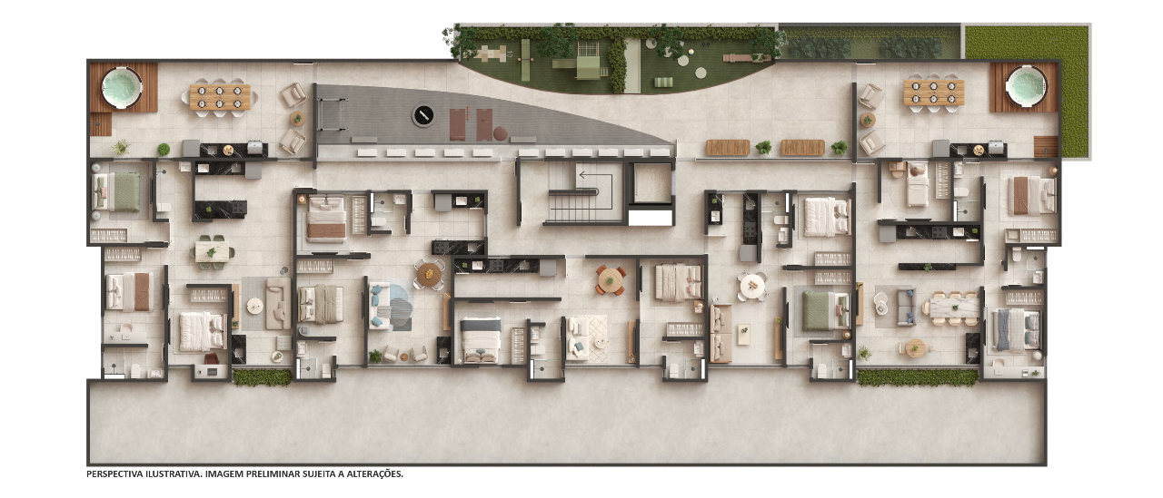 Opções de plantas diferentes sendo; Apartamentos garden com 113,50m² possuindo três quartos sendo um suíte, sala de estar/jantar, banheiro social, cozinha com área de serviço integrada, área privativa gourmet com hidromassagem.