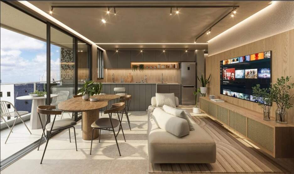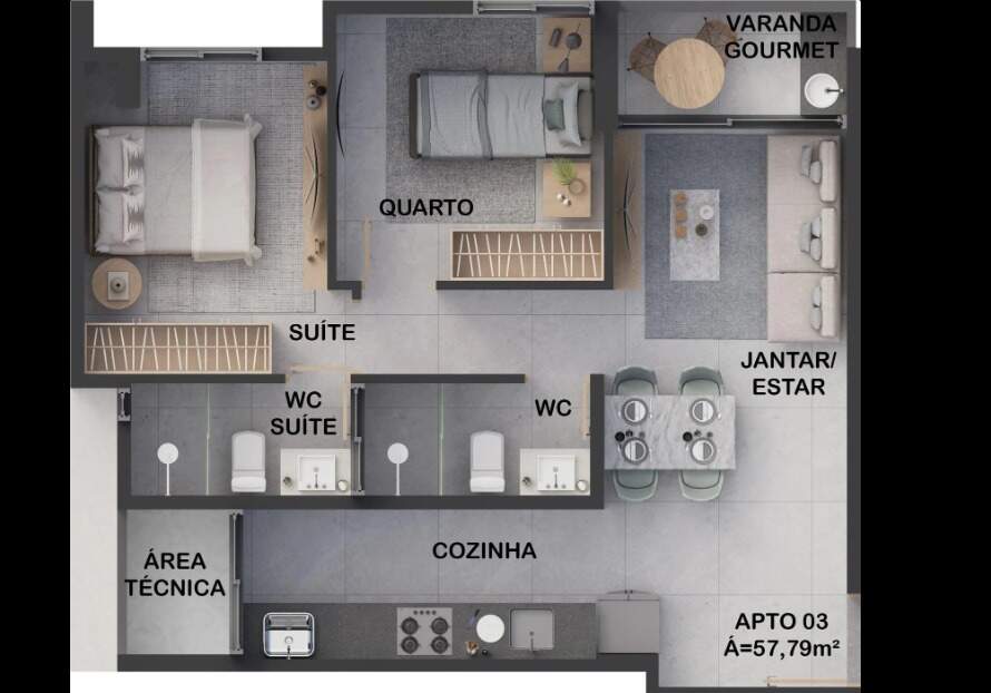 Apartamento com 75,18m² possuindo três quartos sendo um suíte, banheiro social, sala de estar/jantar, cozinha com área de serviço integrada e varanda gourmet.