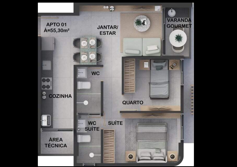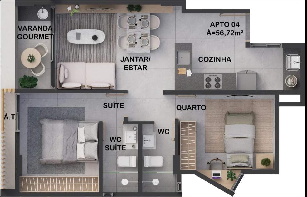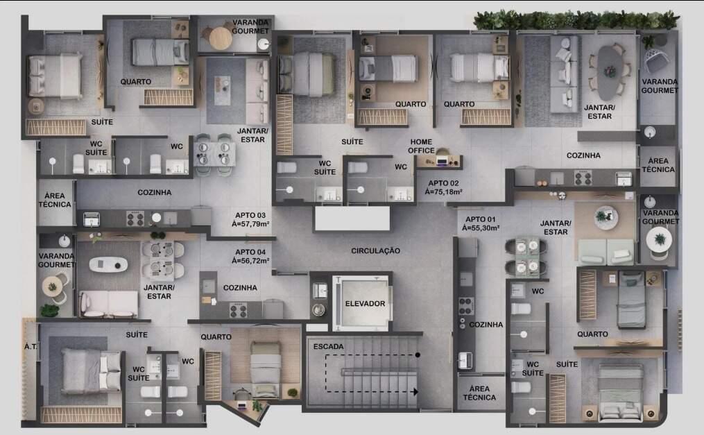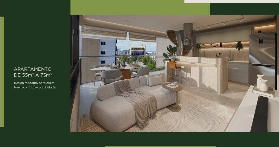 Com opções de plantas diferentes, sendo; Apartamentos com 55,30m² a 57,79m² possuindo dois quartos sendo uma suíte, banheiro social, sala de estar/jantar e cozinha com área de serviço integrada e varanda gourmet.