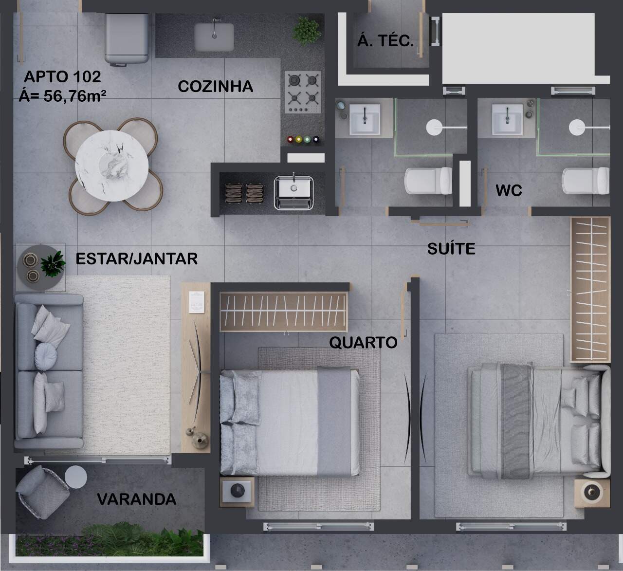 Apartamentos com 56,66m² a 56,76 possuindo dois quartos sendo um suíte, sala de estar/jantar, banheiro social, cozinha com área de serviço integrada e varanda.