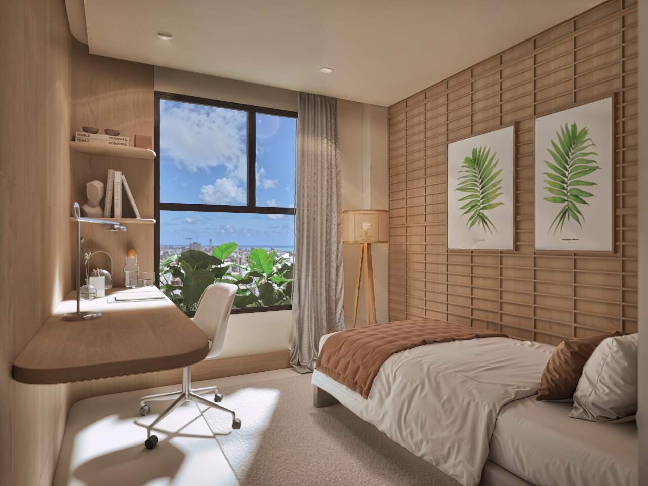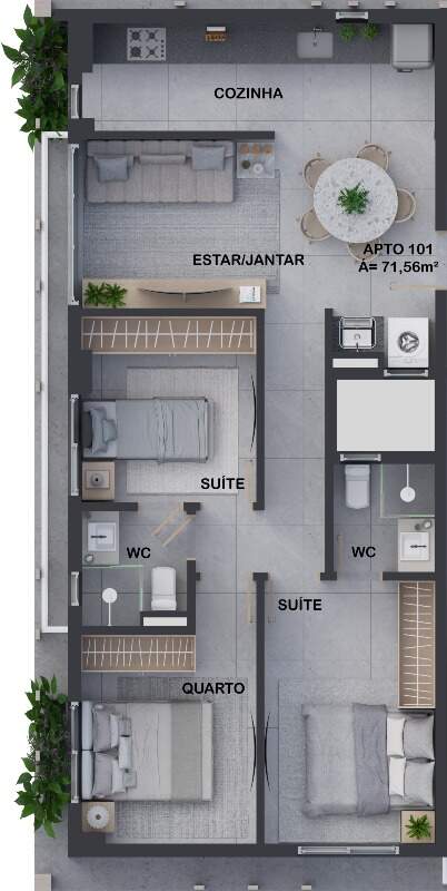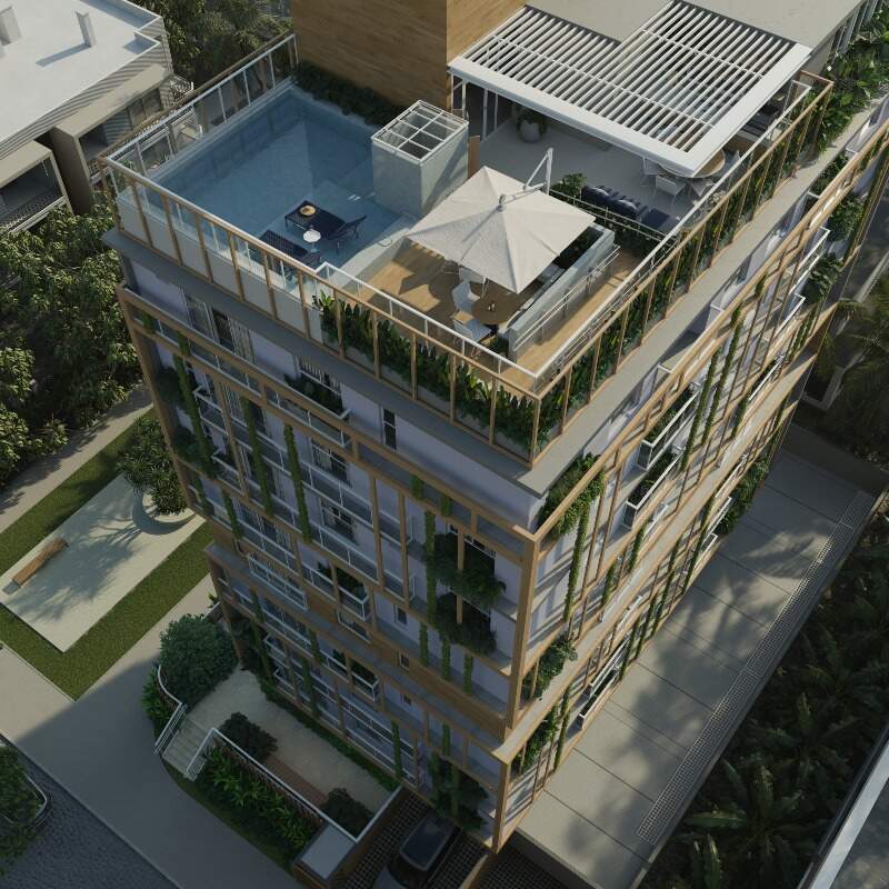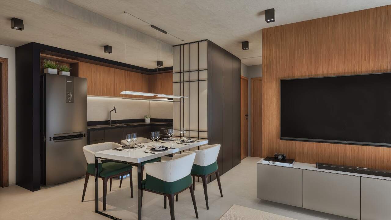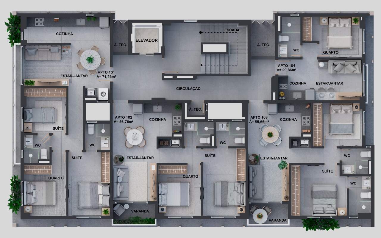 Com opções de plantas diferentes, sendo; Apartamentos com 29,86m² a 71,56m² possuindo um quarto, sendo um suíte, banheiro social, sala de estar/jantar e cozinha com área de serviço integrada.
