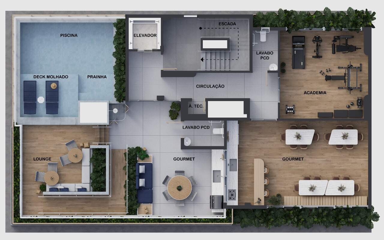 O empreendimento tem uma área de lazer com piscina, hidromassagem, academia, espaço gourmet, pet place, salão de festas, churrasqueira, bicicletário, playground, terraço, coworking e elevador para garantir a sua diversão.