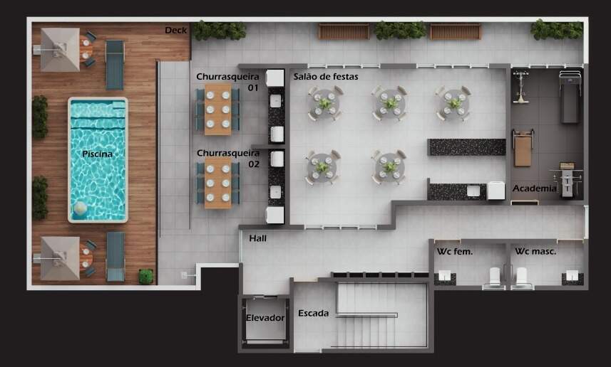 O empreendimento tem uma área de lazer com piscina, academia, espaço gourmet, churrasqueira e elevador para garantir a sua diversão.