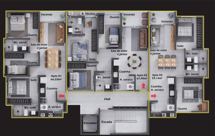 Apartamentos com 67,94m² possuindo três quartos sendo um suíte, sala de estar/jantar, banheiro social, cozinha com área de serviço integrada.