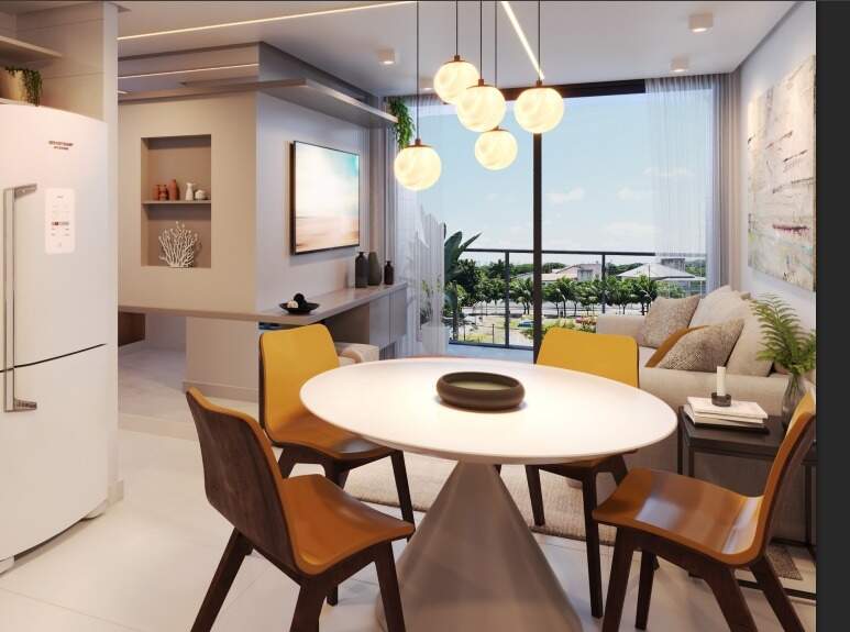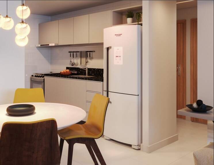 Com opções de plantas diferentes, sendo; Apartamentos com 59,14m² possuindo dois quartos, sendo um suíte, banheiro social, sala de estar/jantar e cozinha com área de serviço integrada.
