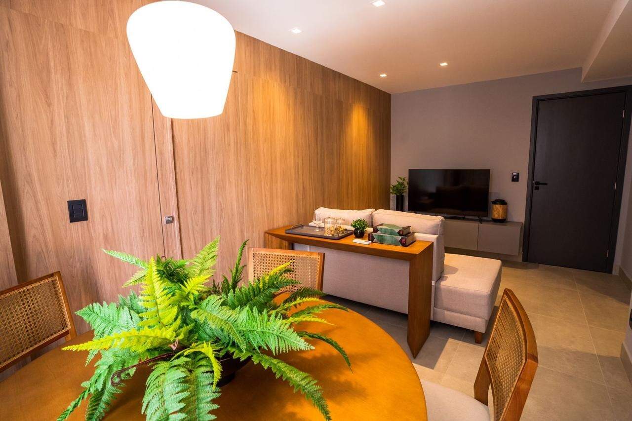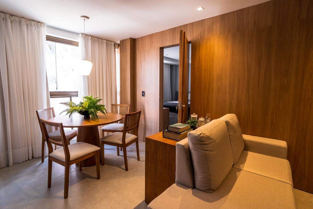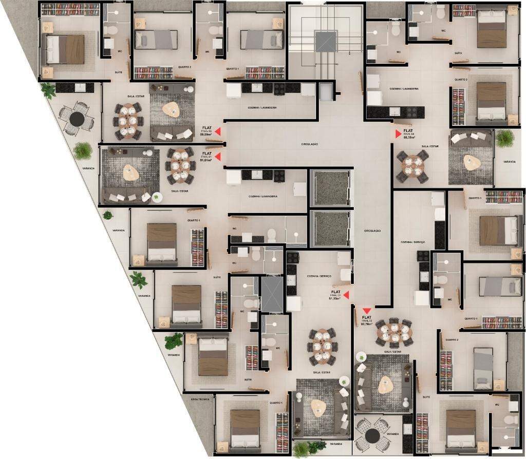 Apartamentos com opções de plantas entre 56m² e 65m², com 2 ou 3 quartos, com ou sem suíte, com 1 ou 2 vagas de garagem, com sala, cozinha, varanda e área de serviço.