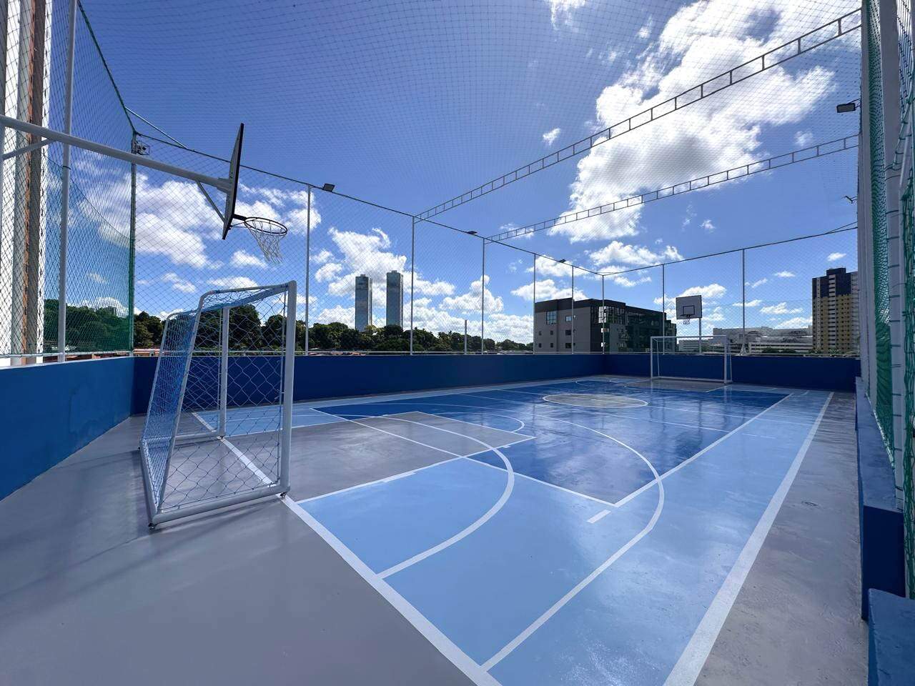 > Prédio com piscina, churrasqueira, playground, quadra poliesportiva, academia e salão de festas;