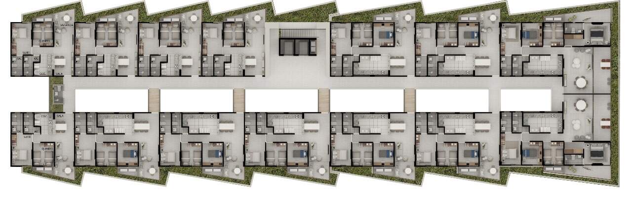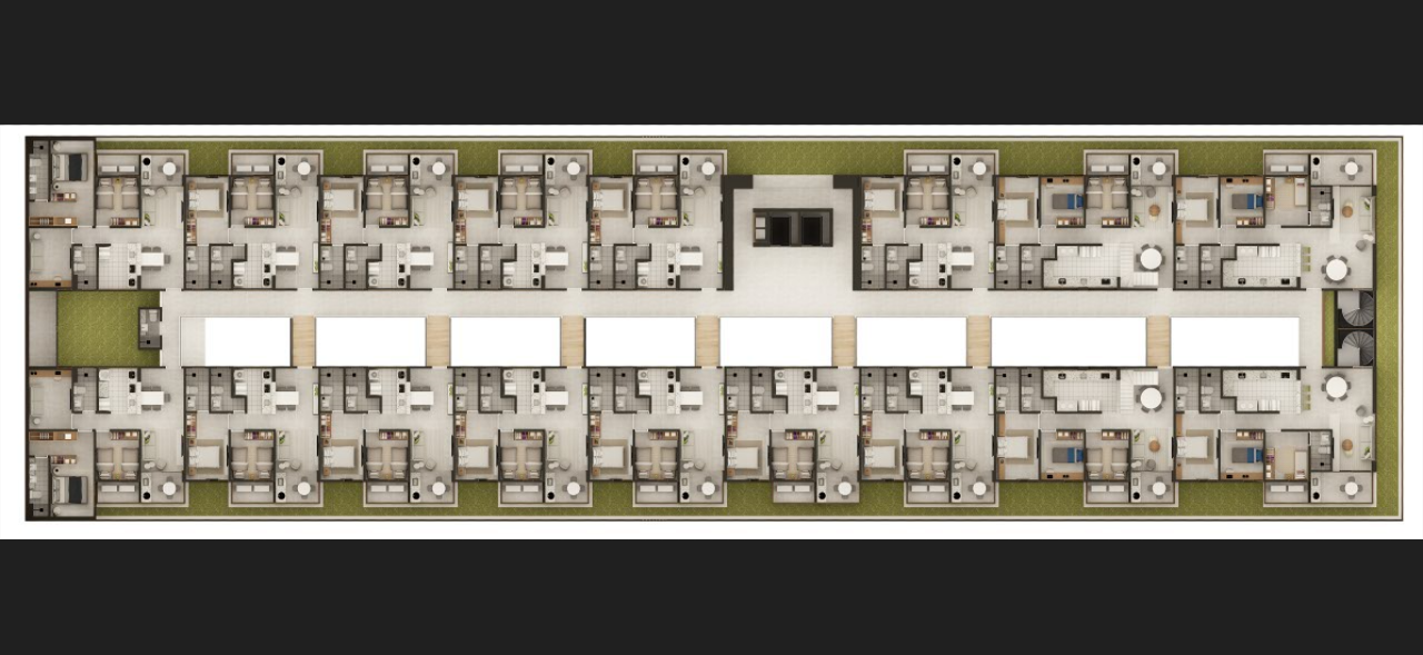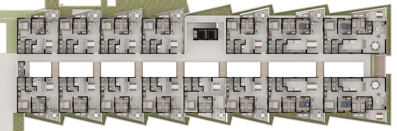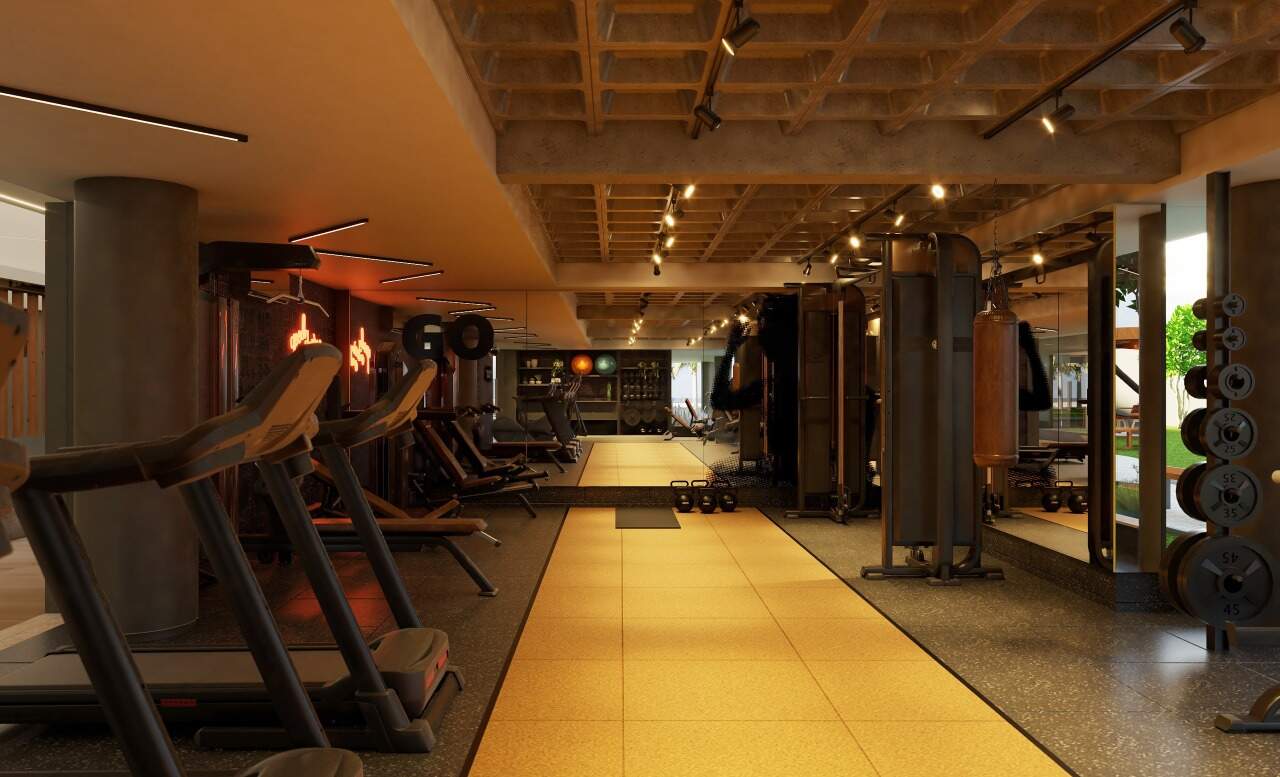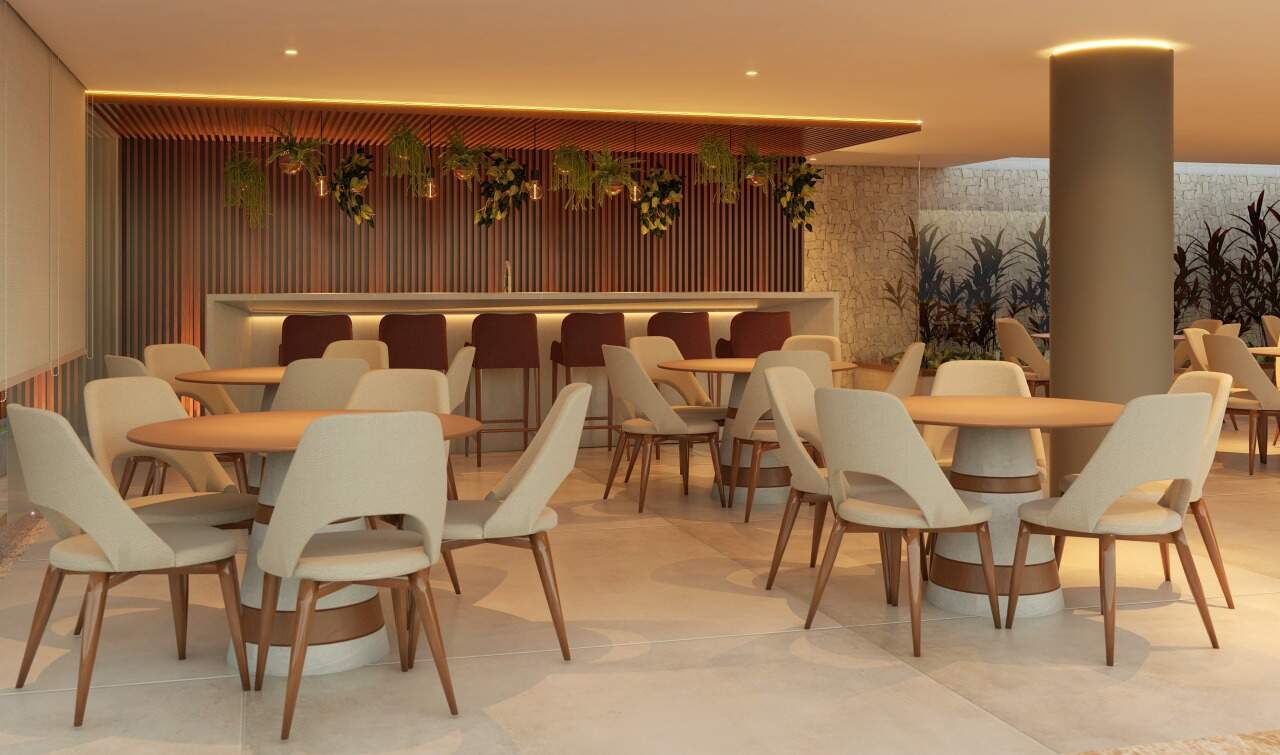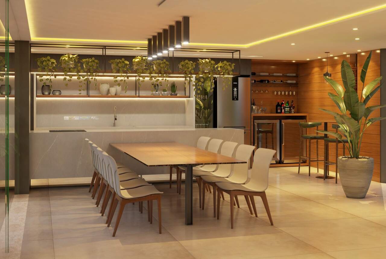 Coberturas duplex com 168m² a 170m² possuindo três quartos sendo uma suíte, banheiro social, sala de estar/jantar, cozinha com área de serviço integrada e terraço gourmet privativo com churrasqueira e piscina.