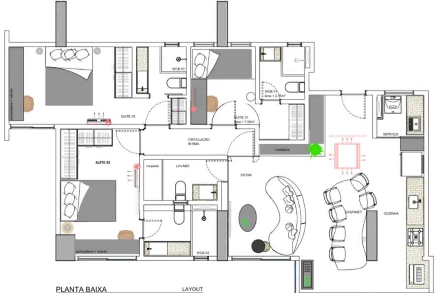 Apartamento com sala ampla para dois ambientes integrada à varanda, cozinha com área de serviço incorporada, três quartos, todos suítes, e um banheiro social. Um espaço planejado para oferecer conforto, praticidade e elegância em cada detalhe.