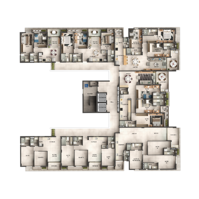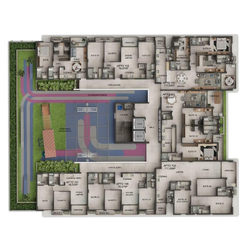 Escolha o apartamento que mais se encaixa com você com opções de planta entre 58m² a 125m², com 2 ou 3 quartos, sendo 1, 2 ou 3 suítes, com sala, cozinha, varanda, área de serviço, elevador e 1 ou 2 vagas de garagem.