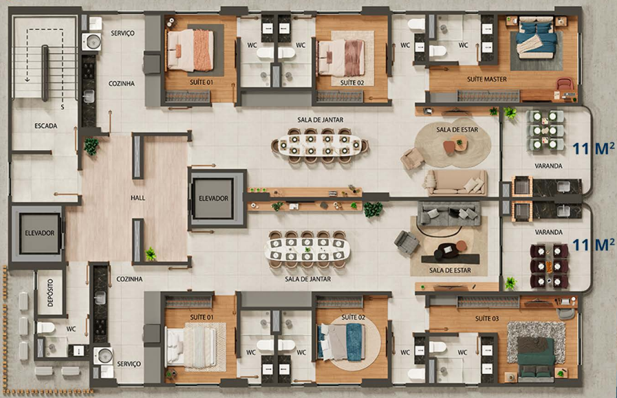 Com opções de plantas diferentes, sendo; Apartamentos com 129m² e 131m² possuindo três suítes, banheiro social, sala de estar/jantar, cozinha com área de serviço separada e varanda gourmet.