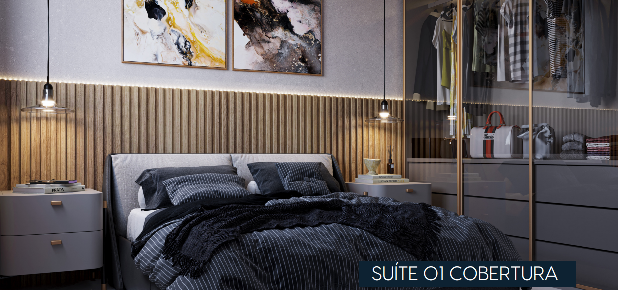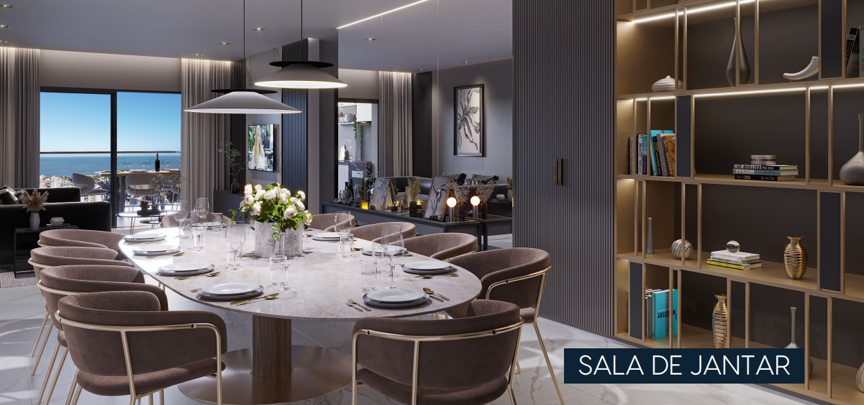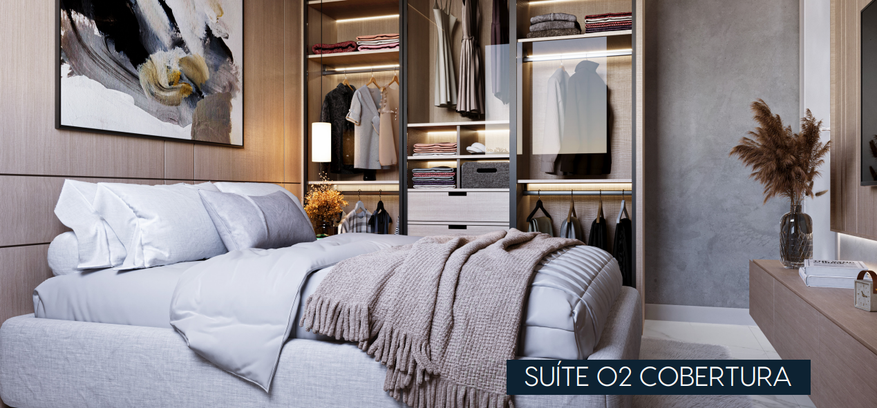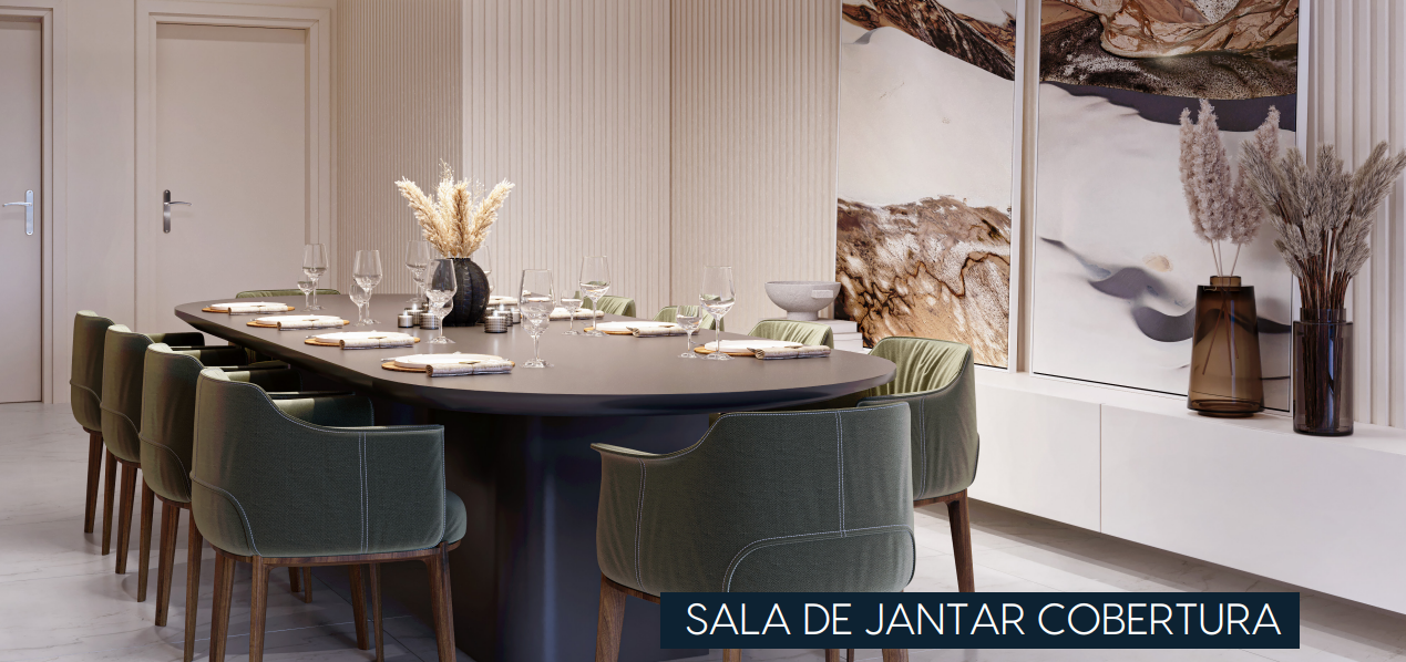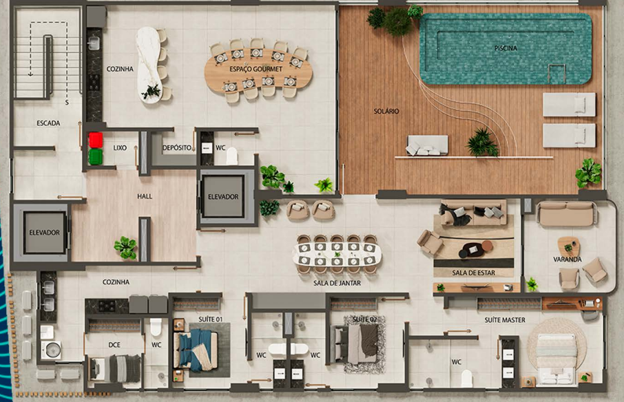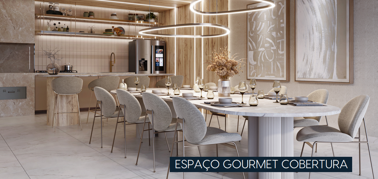 Cobertura com 260m² possuindo três suítes, banheiro social, sala de estar com varanda, sala de jantar, cozinha com área de serviço separada e DCE completo, área externa privativa com espaço gourmet, banheiro, deposito e piscina.
