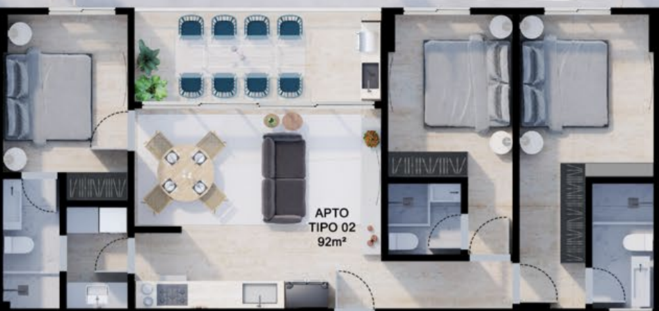 A sala ampla para dois ambientes com varanda gourmet oferece um local perfeito para relaxar ou receber visitas, enquanto a cozinha com área de serviço integrada traz praticidade e organização para o dia a dia. Os três quartos, todos suítes confortáveis e privativos, juntamente com o banheiro social reversivo bem planejado, completam este imóvel que atende todas as suas necessidades.
