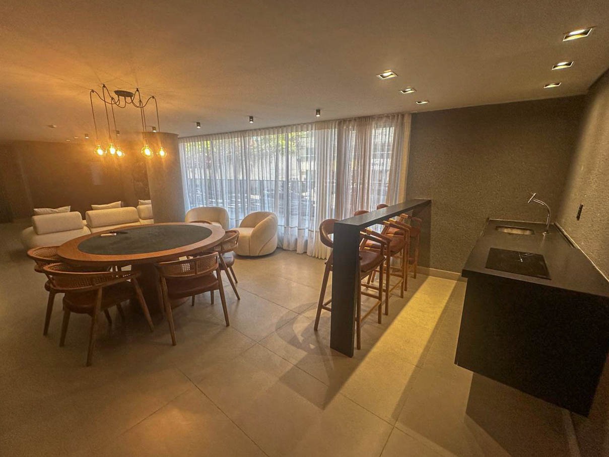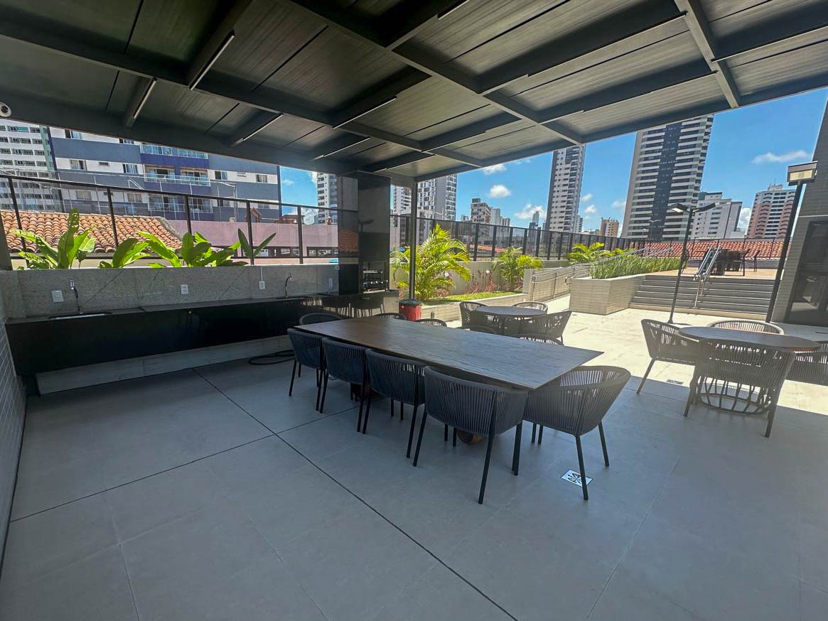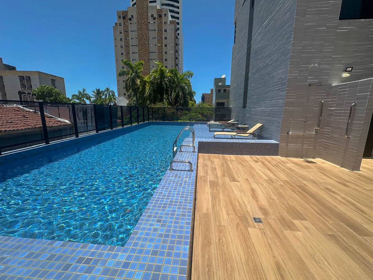 > Área de lazer com piscina, churrasqueira e espaço gourmet;