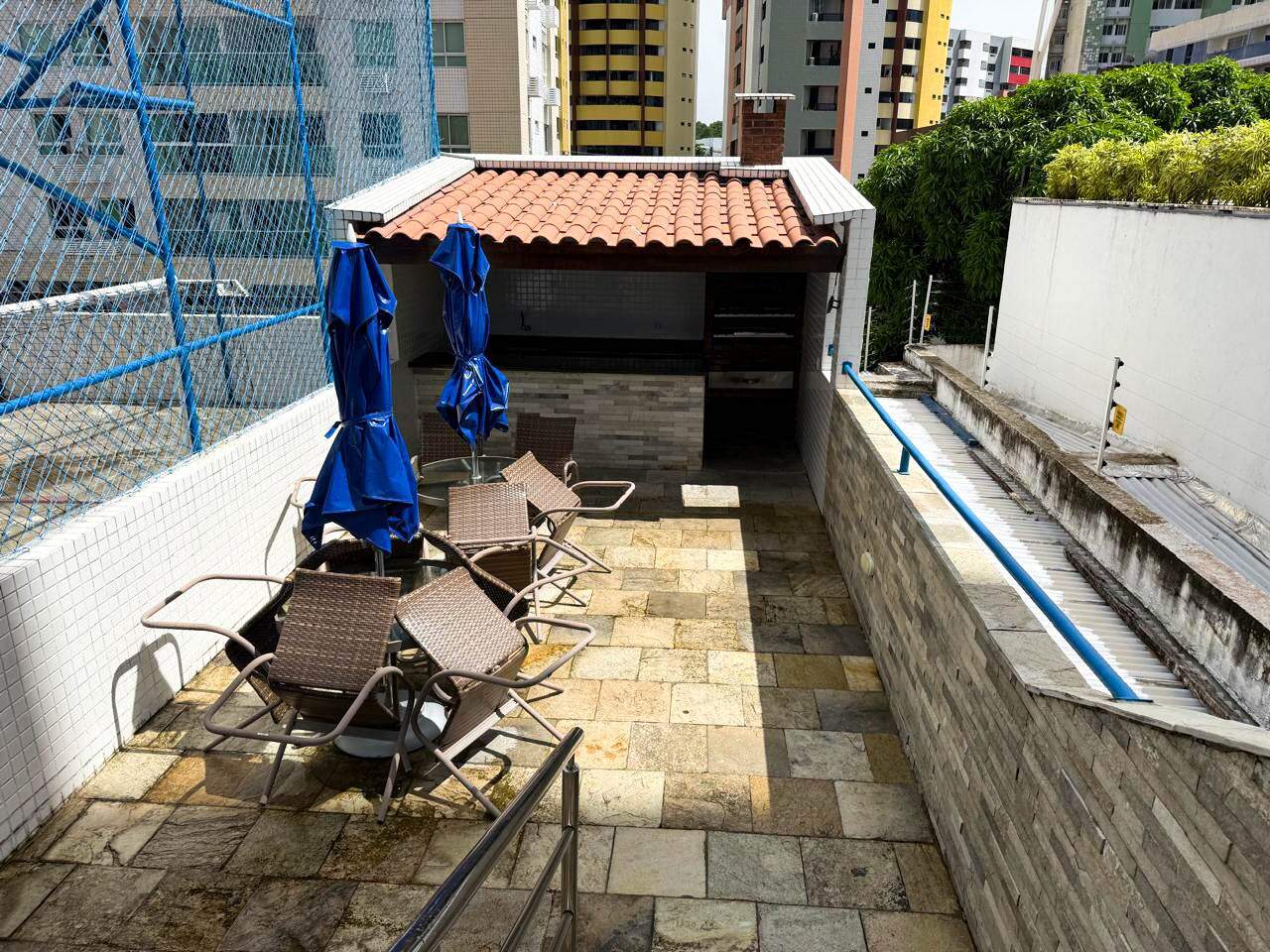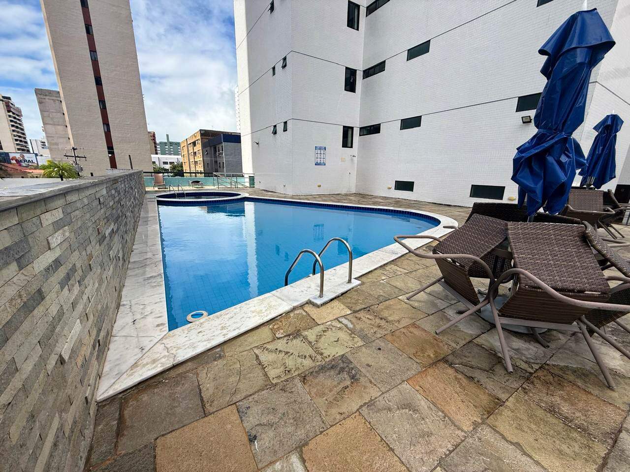 > Área de lazer com piscina e churrasqueira;