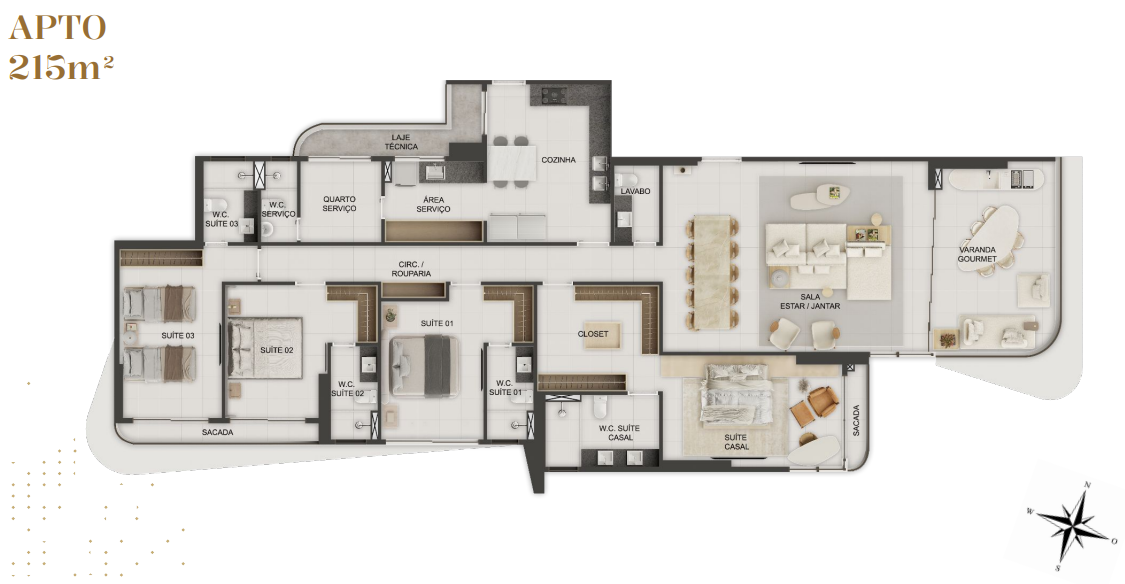 Apartamentos com 215m² possuindo quatro suítes, sala de estar/jantar, banheiro social, cozinha com área de serviço integrada, DCE completo e varanda gourmet;