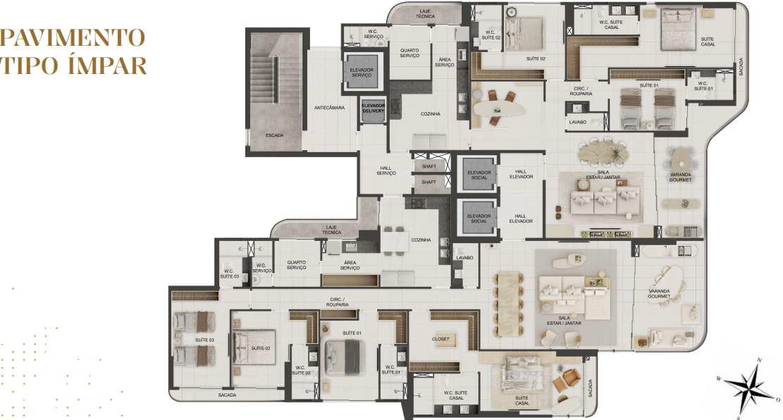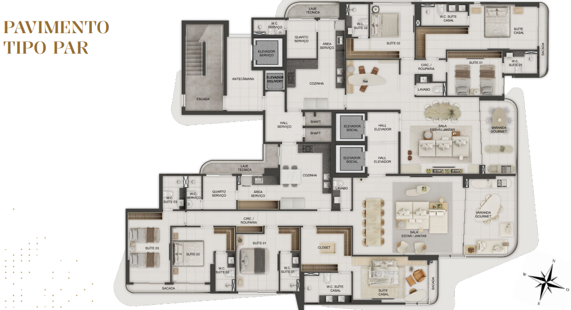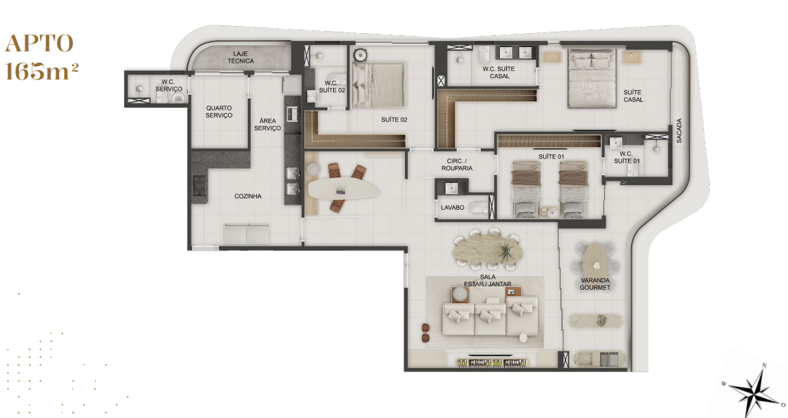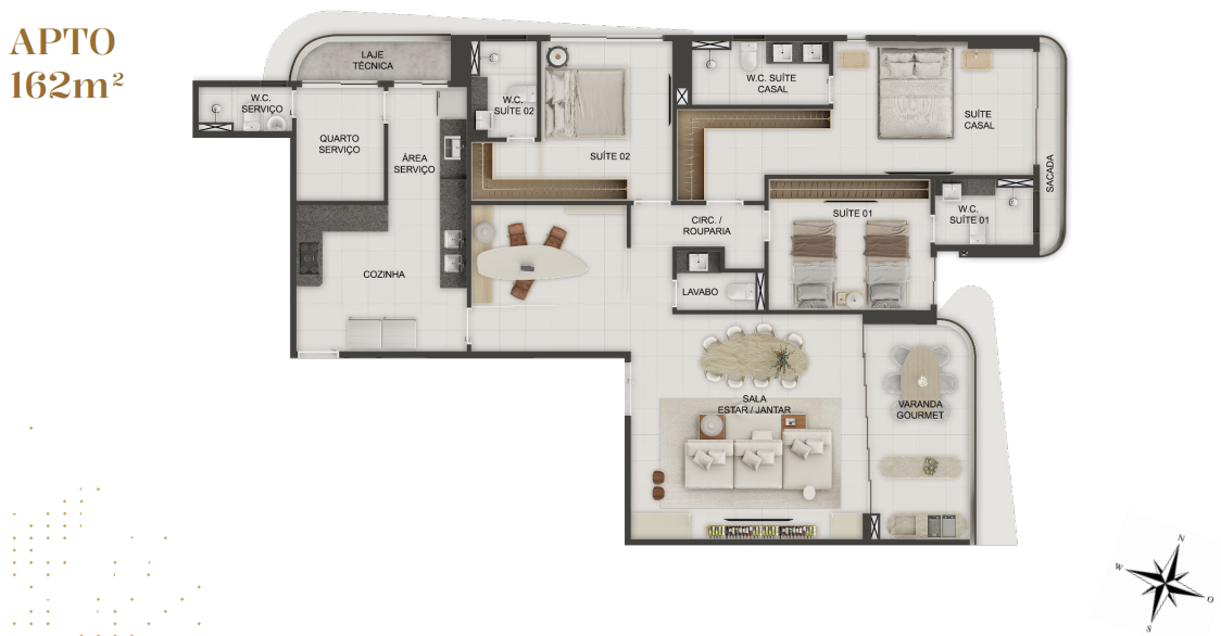 Com opções de plantas diferentes, sendo; Apartamentos com 162m² a 165m² possuindo três suítes, banheiro social, sala de estar/jantar, cozinha com área de serviço integrada, DCE completo e varanda gourmet;