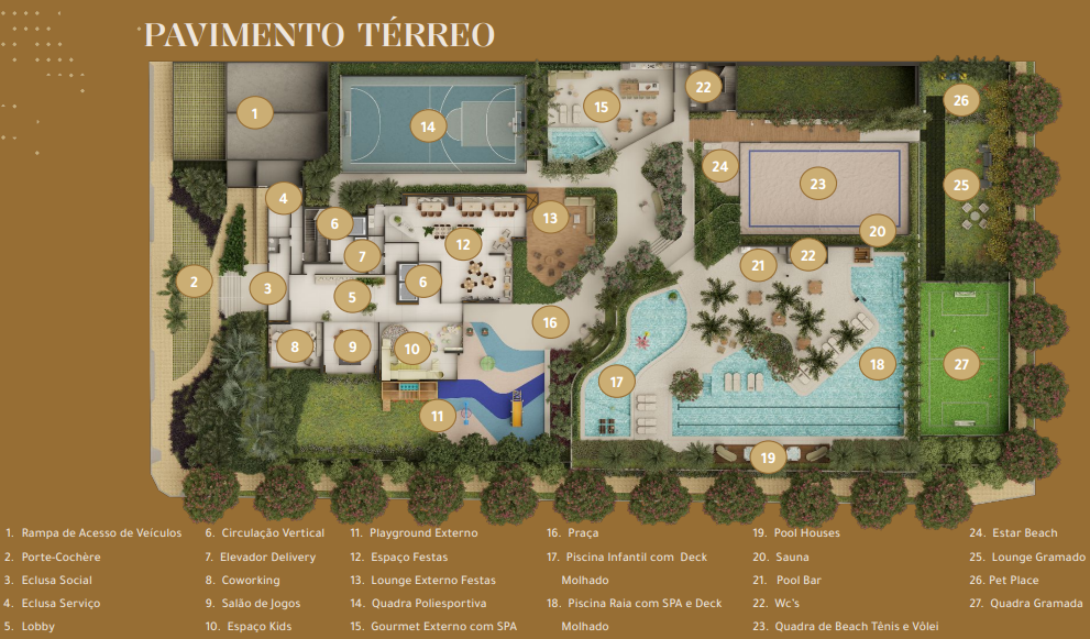 O empreendimento tem uma vasta área de lazer com piscina, espaço gourmet, playground, Sky lounge, quadra poliesportiva, praça, sauna, hidromassagem, academia, Salão de festas, Salão de jogos, Espaço kids, pool bar, coworking, pet place, quadra de beach tênis e volei, quadra gramada, elevadores e muito mais para garantir a sua diversão.