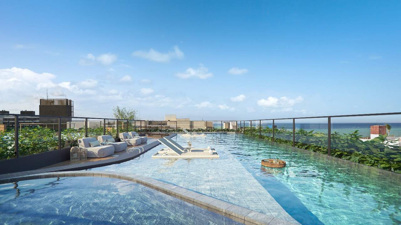 Cobertura com 58m² a 63m² possuindo um banheiro, cozinha de apoio e área de lazer gourmet com piscina privativa.