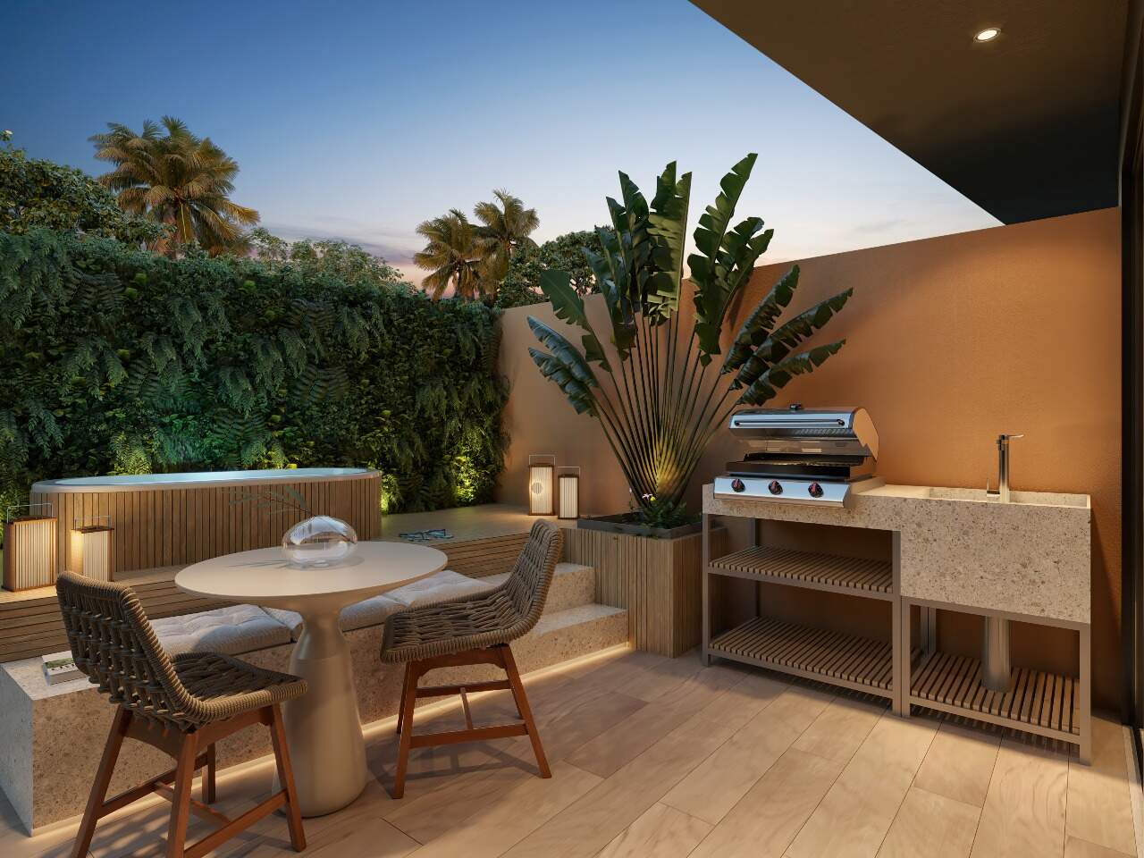 Apartamentos garden com 29m² a 34m² possuindo um banheiro, cozinha de apoio e área privativa externa.