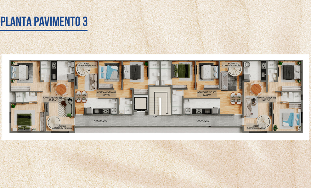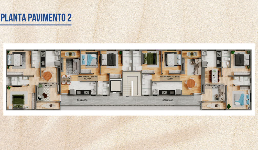 Com opções de plantas diferentes, sendo; Apartamentos com 52m² a 54m² possuindo dois quartos, banheiro social, sala de estar/jantar, cozinha com área de serviço integrada e varanda;
