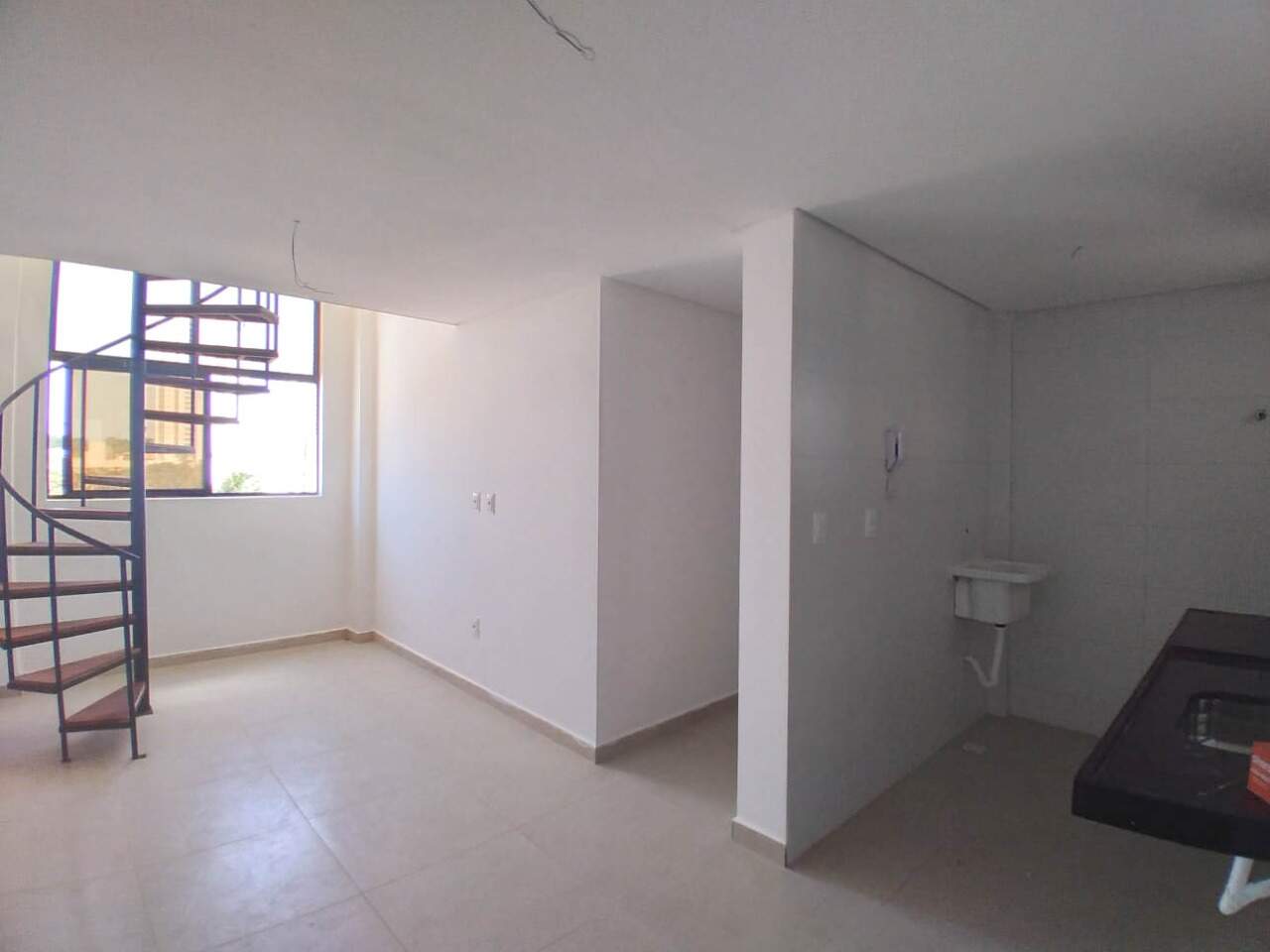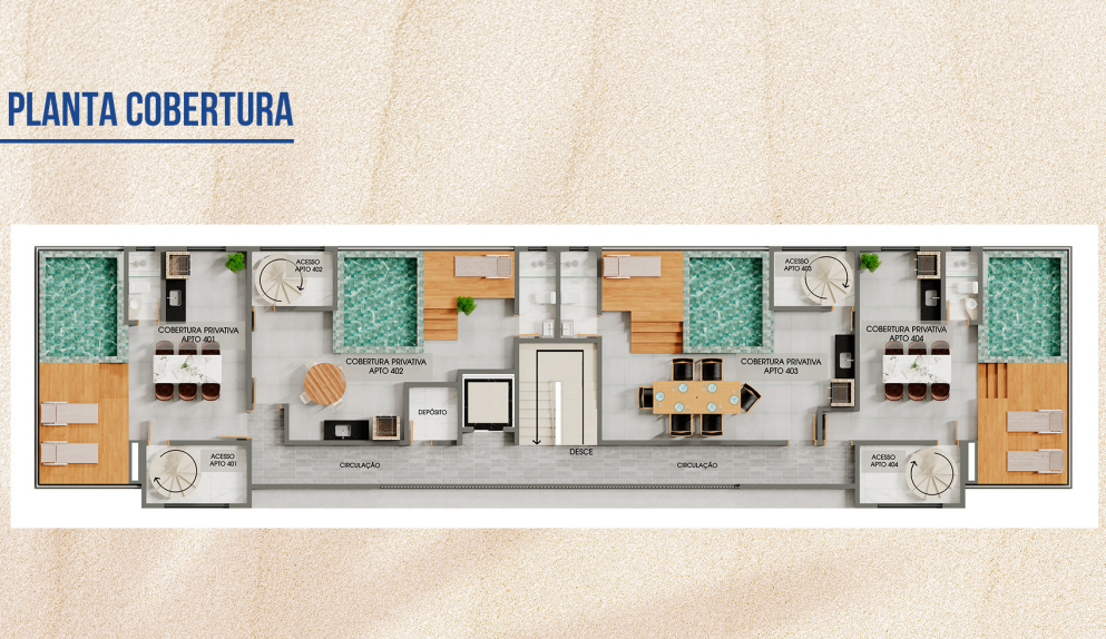Cobertura Duplex com 101m² possuindo dois quartos sendo um suíte, sala de estar/jantar, banheiro social, cozinha com área de serviço integrada e terraço gourmet privativo com churrasqueira e piscina.
