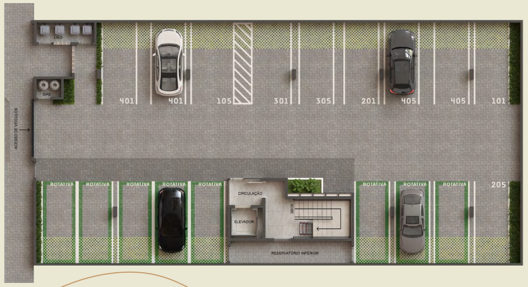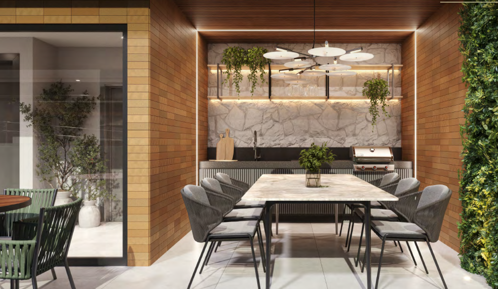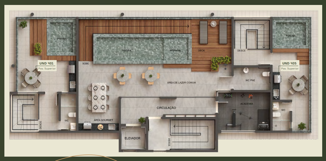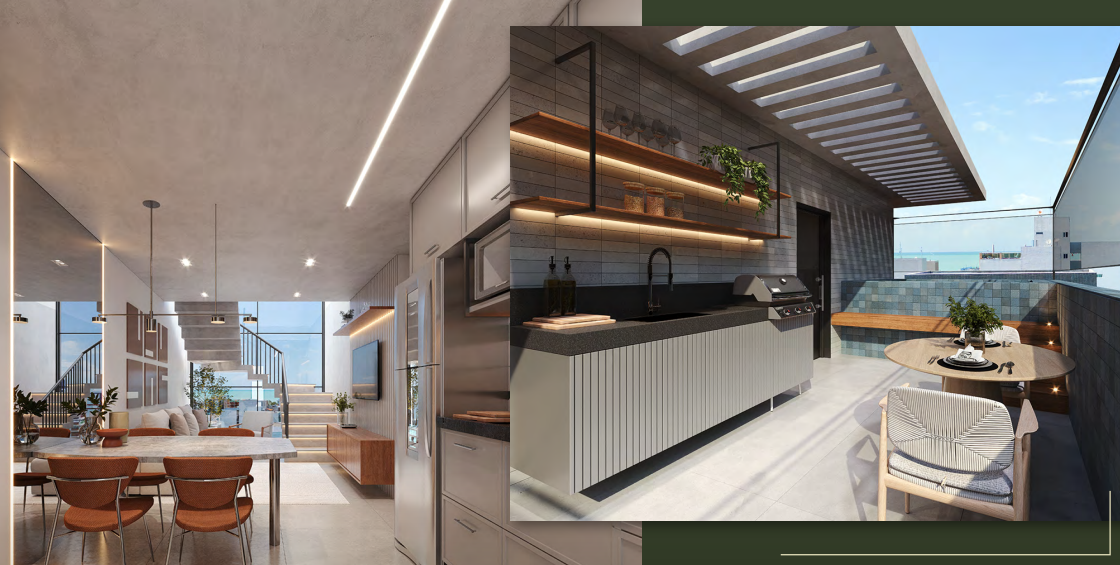 Coberturas Duplex com 97m² a 102m² possuindo dois quartos sendo uma suíte, banheiro social, sala de estar/jantar, cozinha com área de serviço integrada e terraço com área gourmet privativa, churrasqueira e piscina.