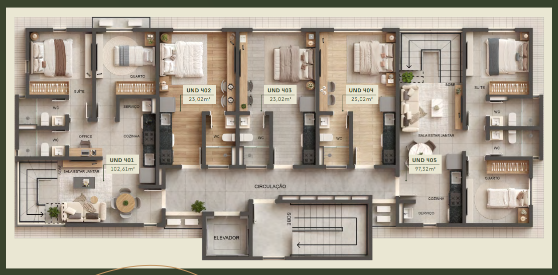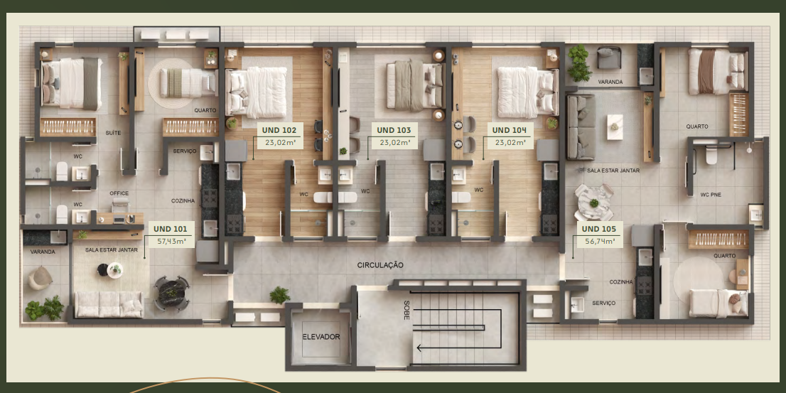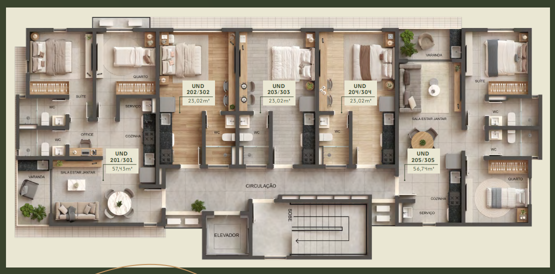 Com opções de plantas diferentes, sendo; Studios com 23m² possuindo um quarto, banheiro social e cozinha de apoio.