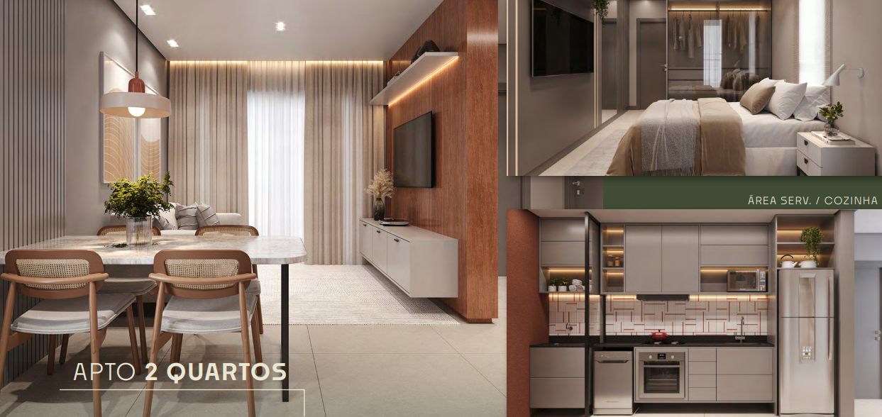 Apartamentos com 56m² a 57m² possuindo dois quartos sendo um suíte, sala de estar/jantar, banheiro social, cozinha com área de serviço integrada e varanda gourmet.