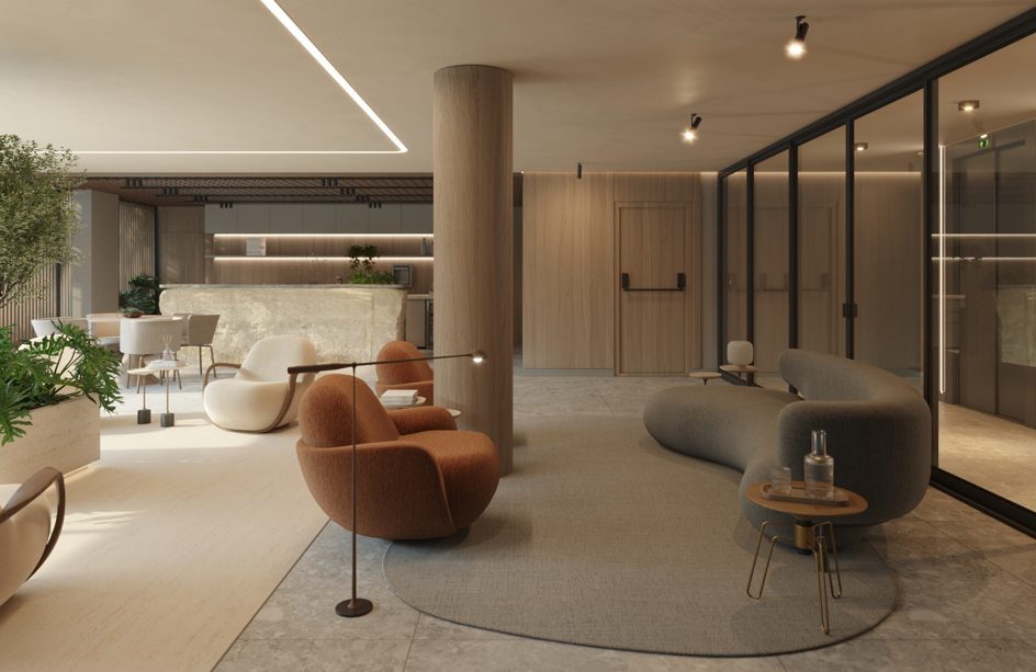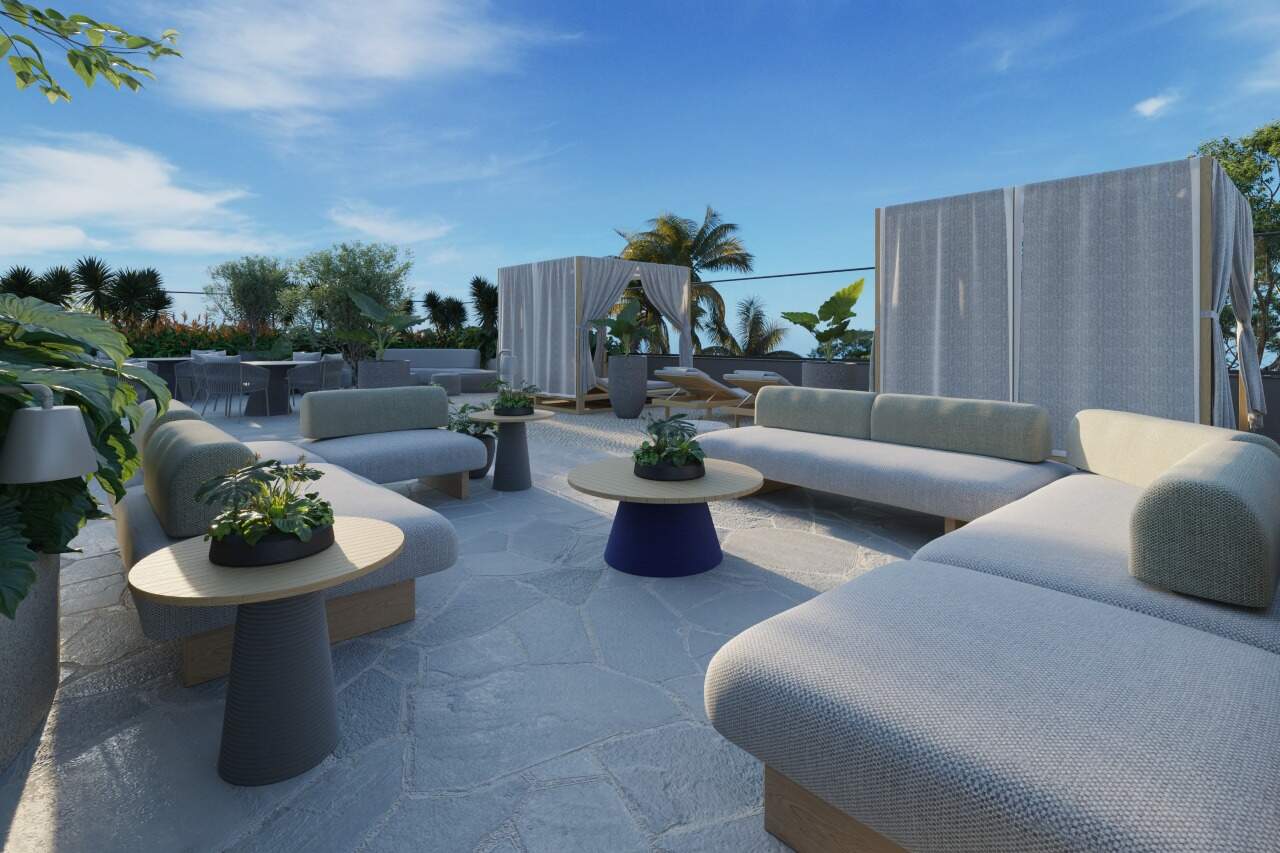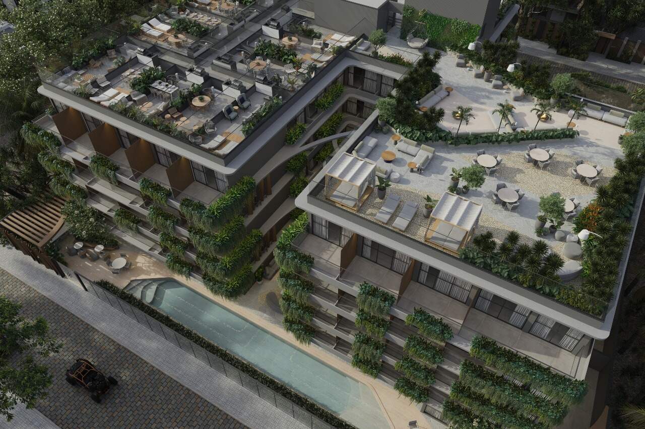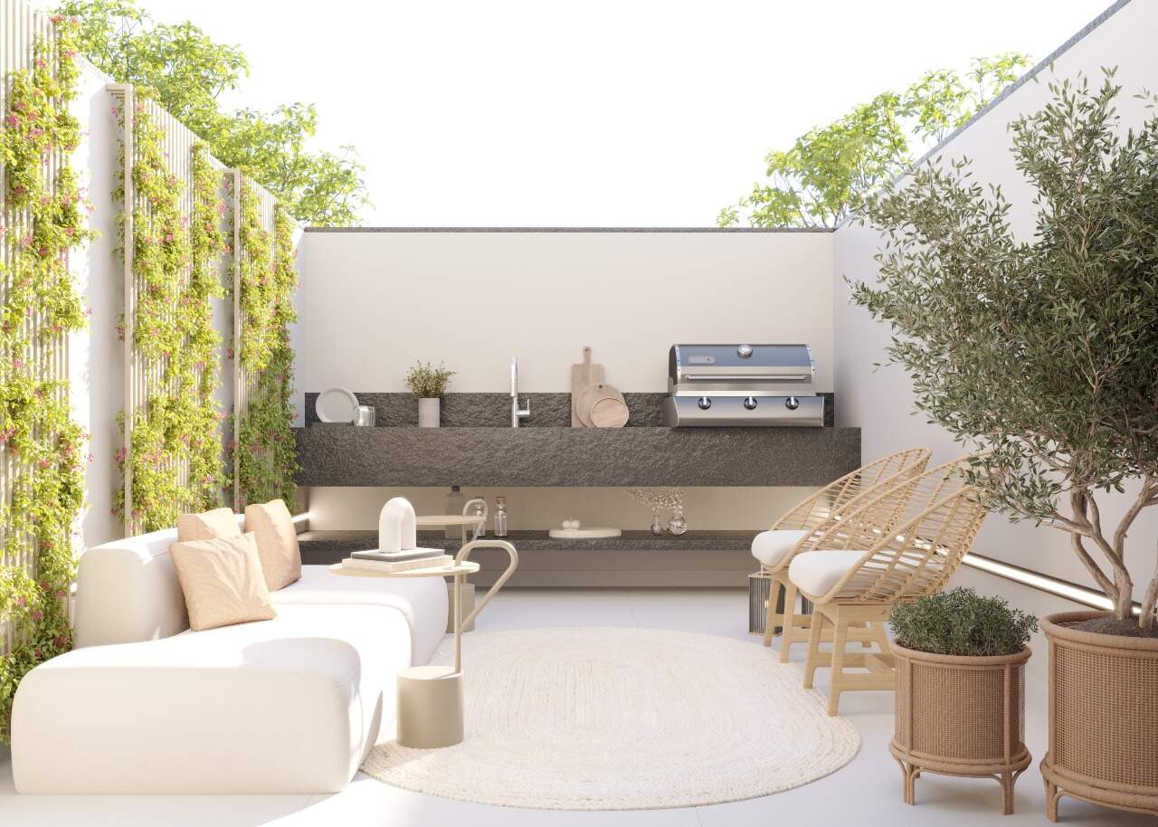 Studios duplex com 53m² a 64m² possuindo um quarto, banheiro, cozinha de apoio e terraço externo privativo.