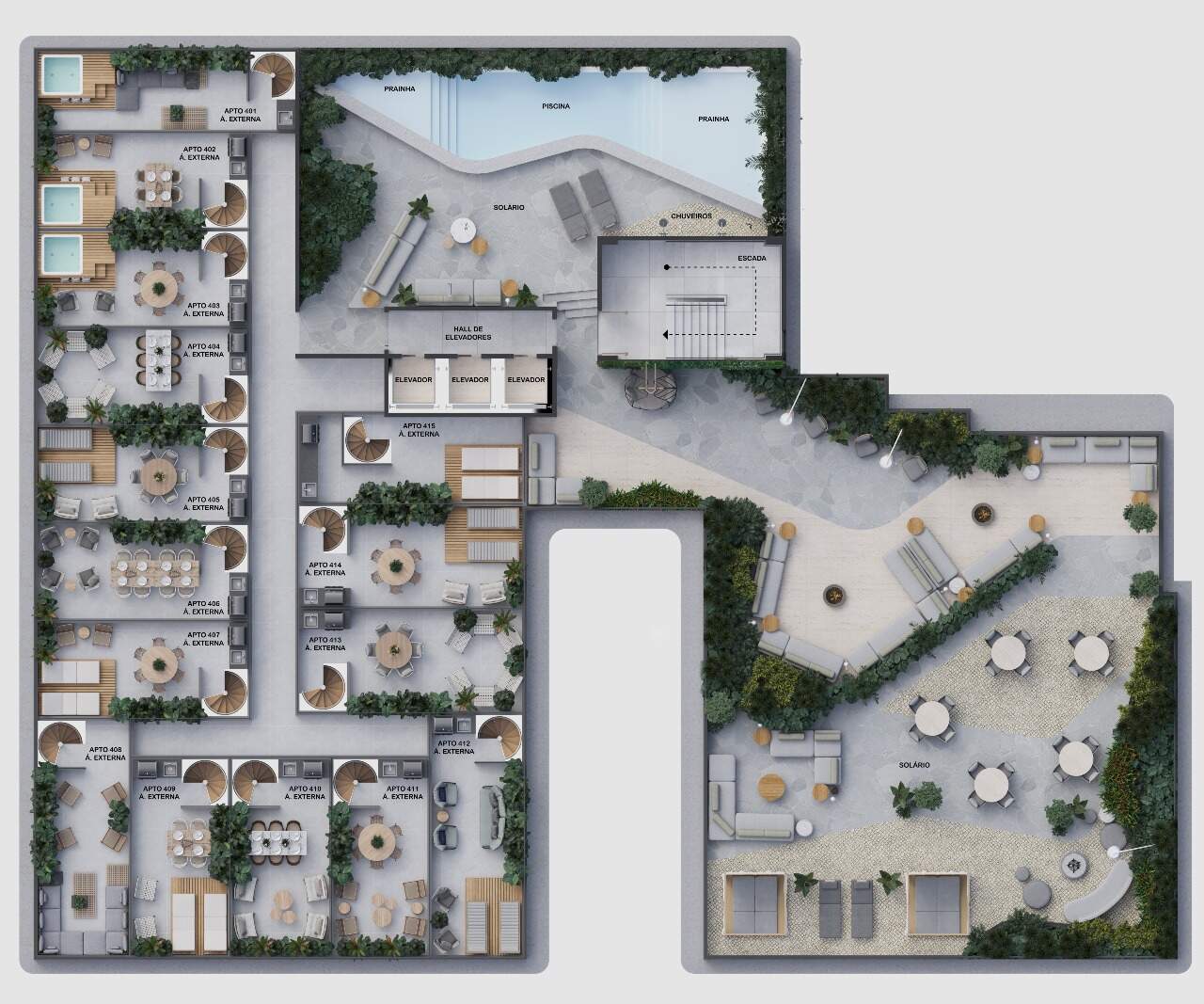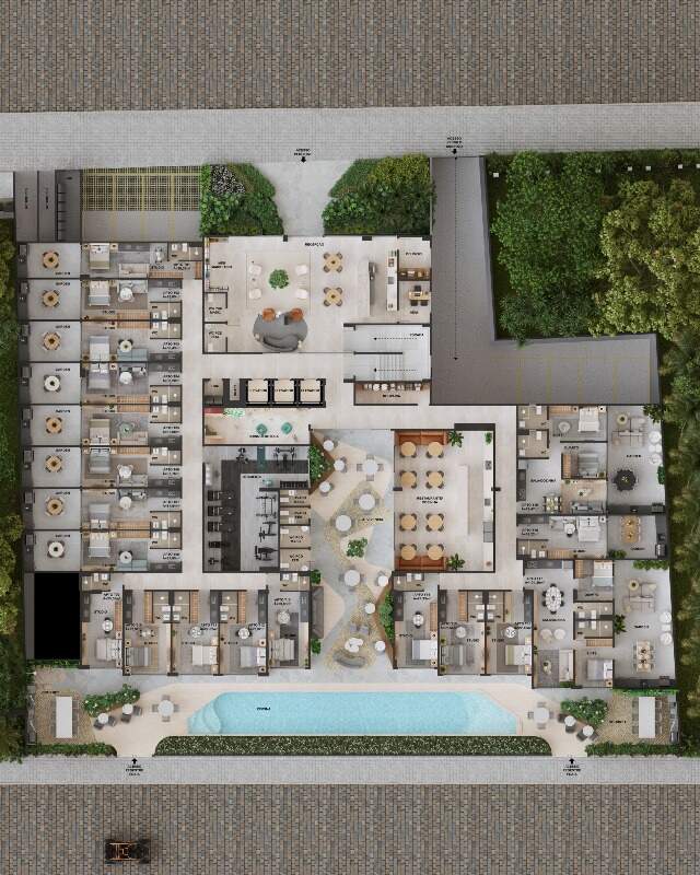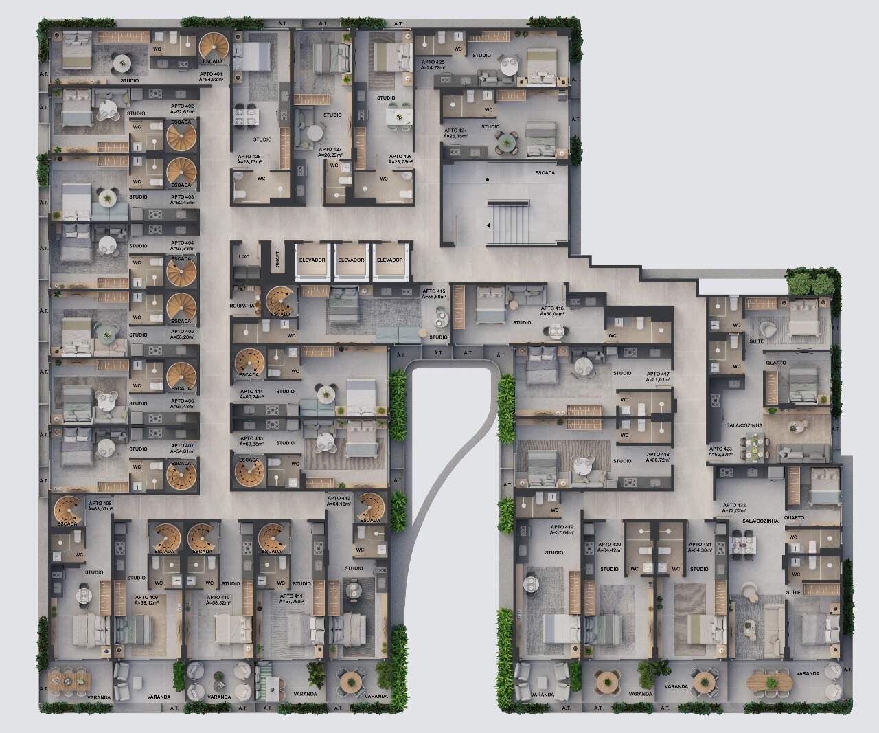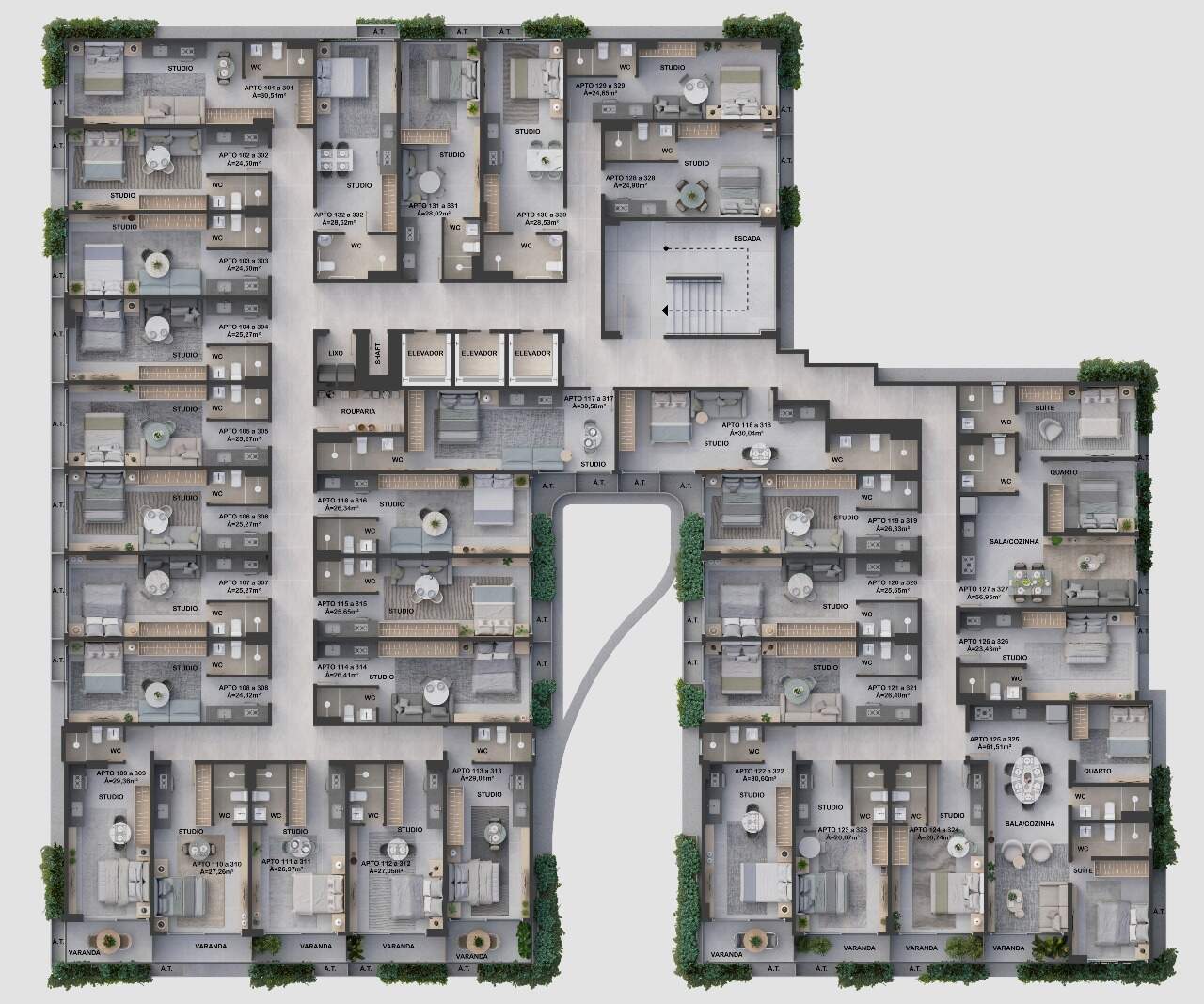 Com opções de plantas diferentes, sendo; Studios garden com 22m² a 23m² possuindo um quarto, banheiro e cozinha de apoio.