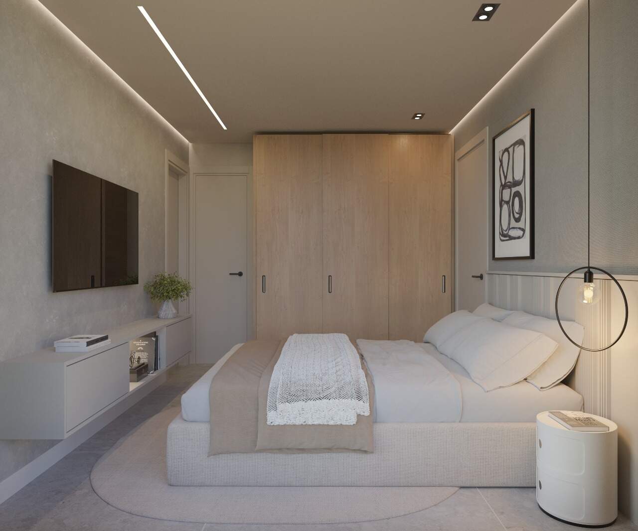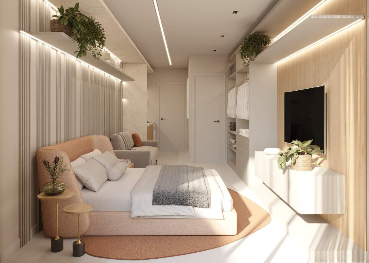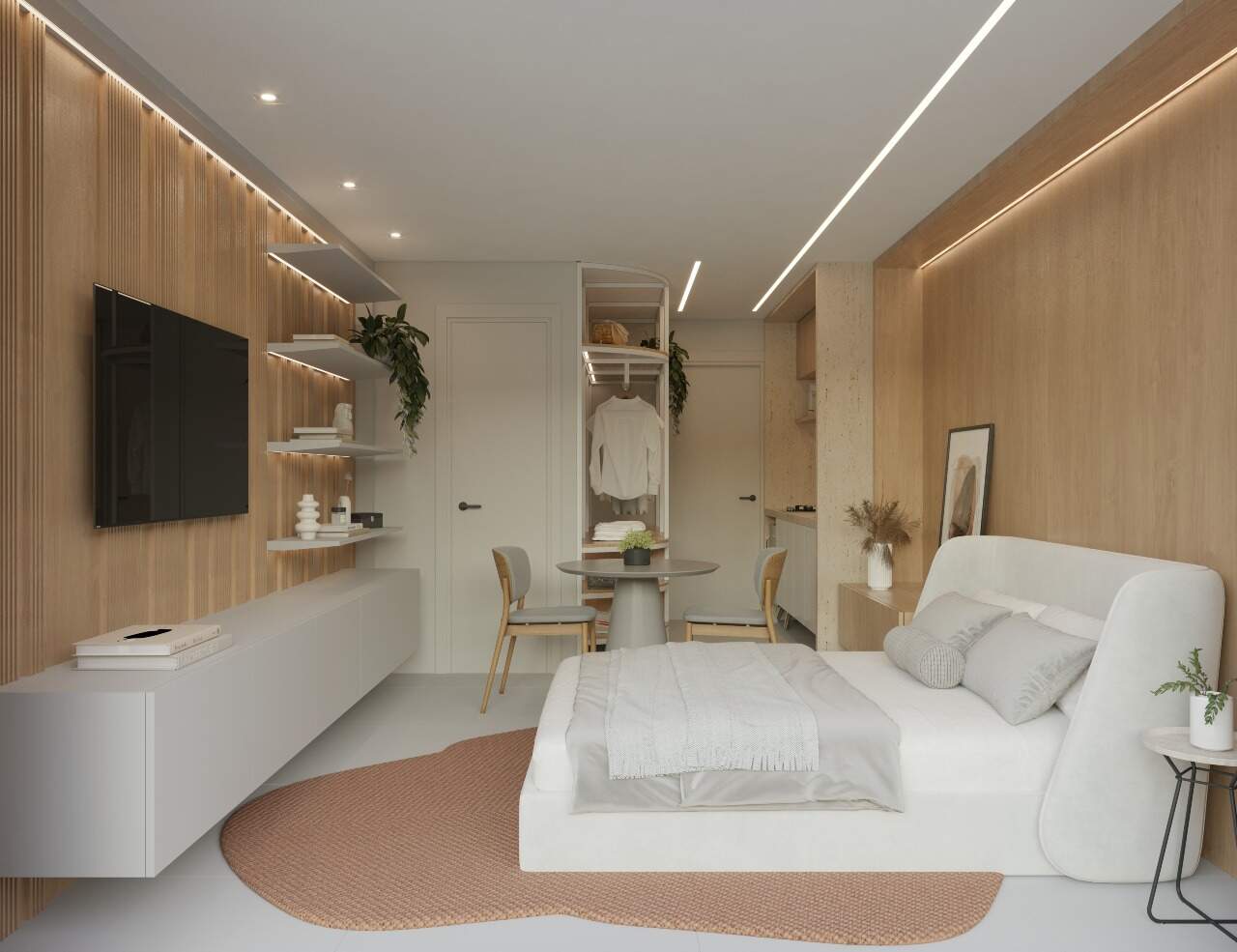 Studios com 25m² a 31m² possuindo um quarto, banheiro e cozinha de apoio.