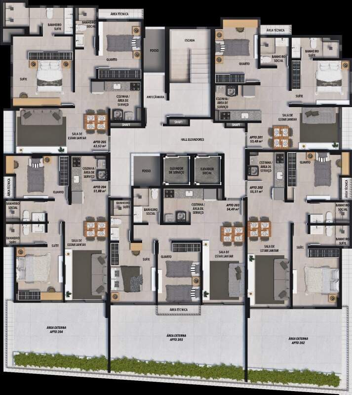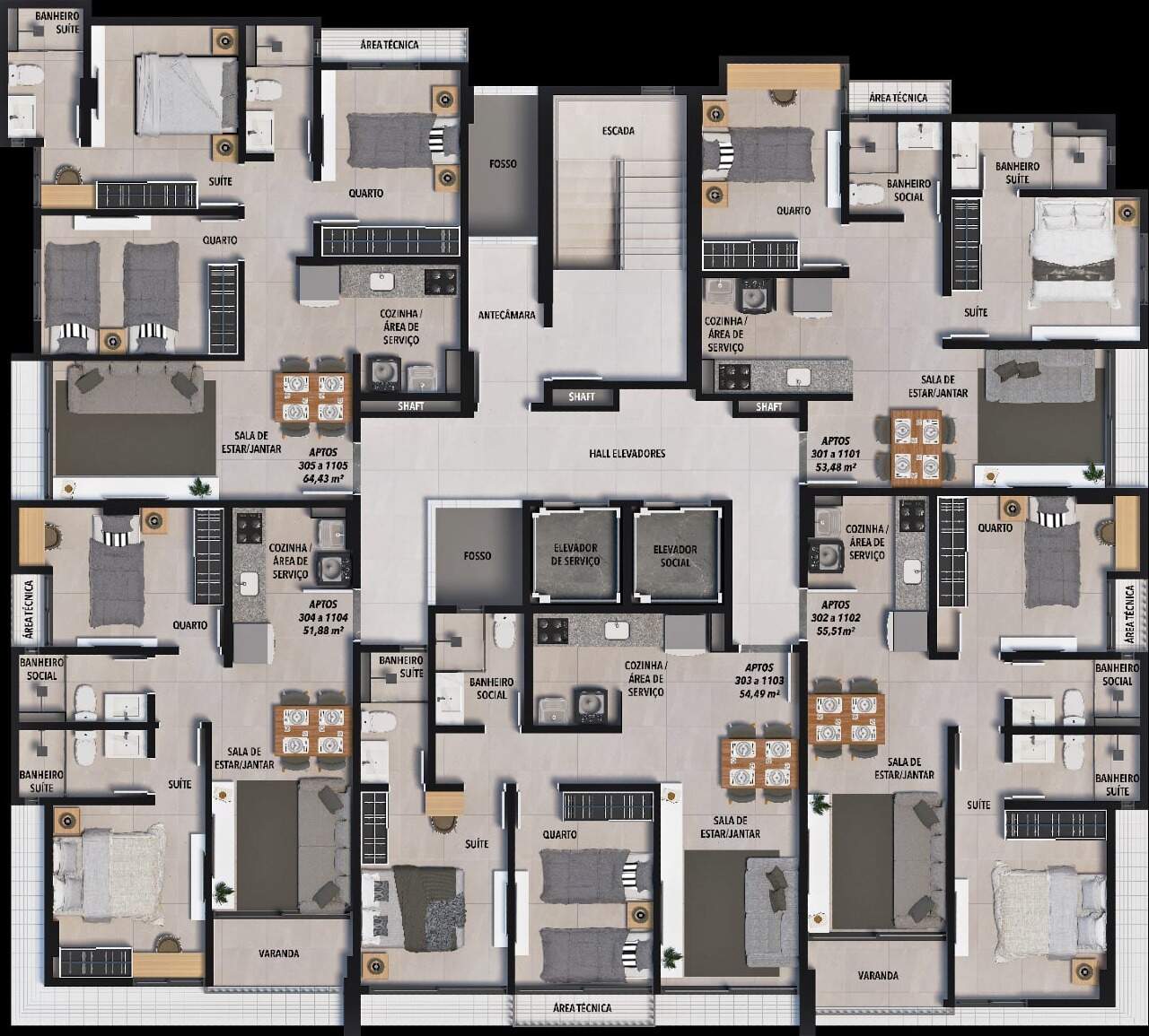 Com opções de plantas diferentes, sendo; Apartamentos com 51m² a 55m² possuindo dois quartos sendo uma suíte, banheiro social, sala de estar/jantar e cozinha com área de serviço integrada e varanda.