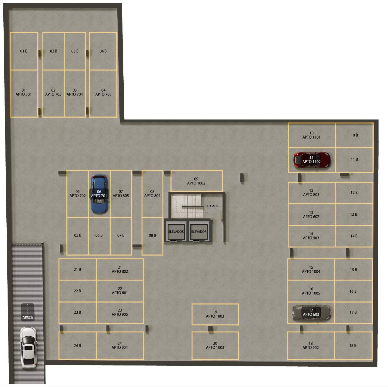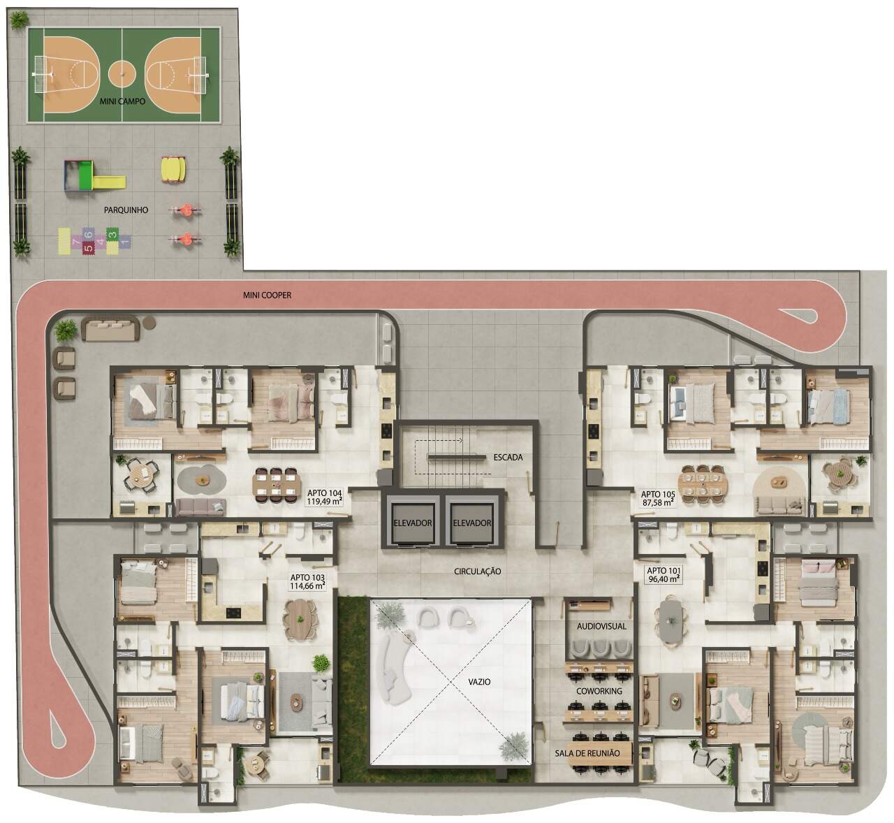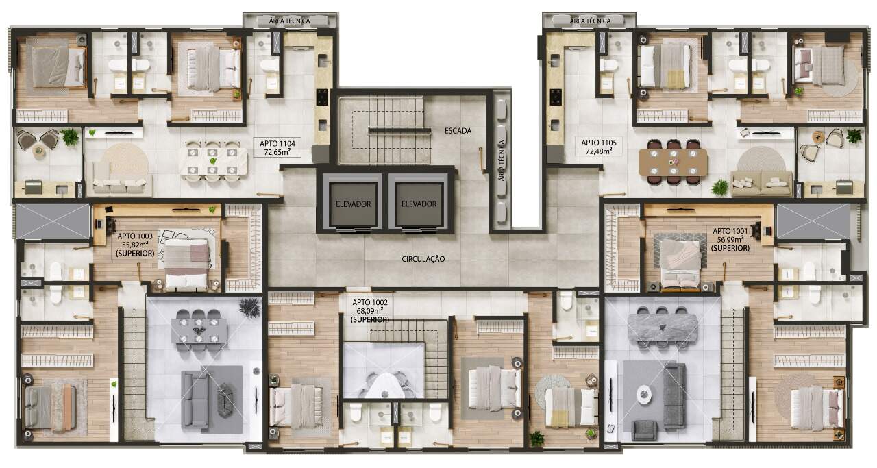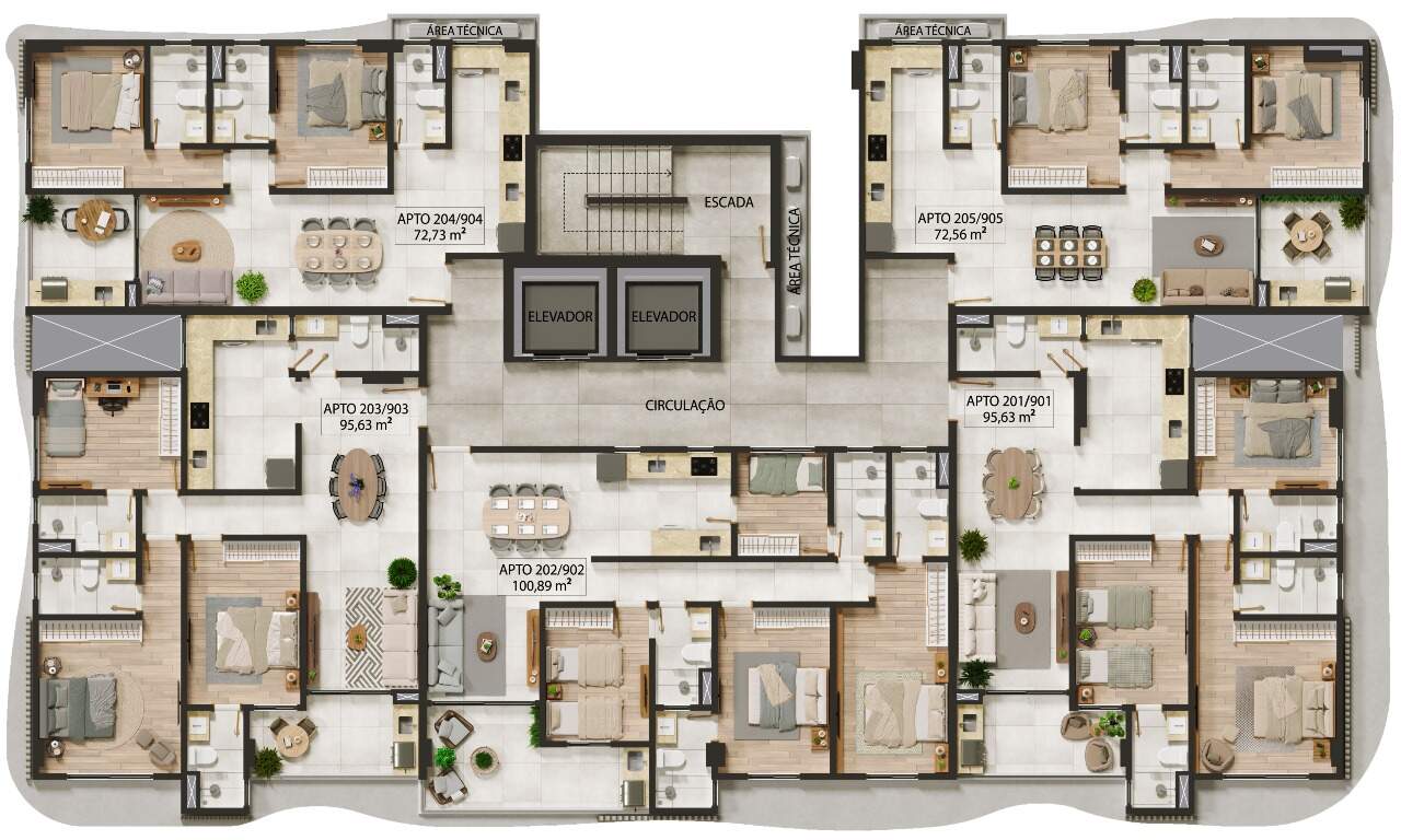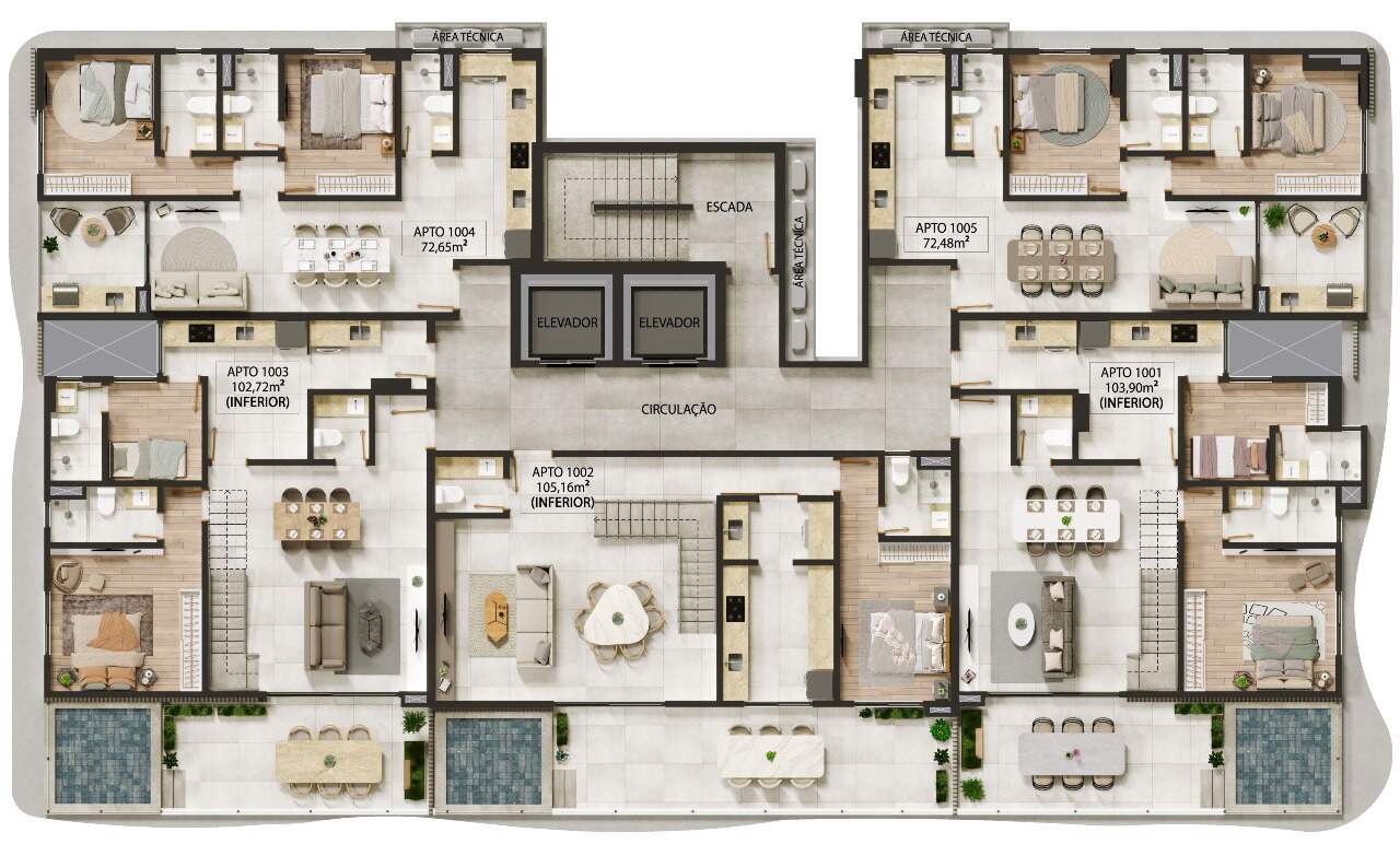 Apartamentos com 158,54m² a 173,25m² possuindo dois a três quartos, duas a três suítes, banheiro social, sala de estar/jantar, cozinha com área de serviço integrada e terraço com área gourmet privativa.