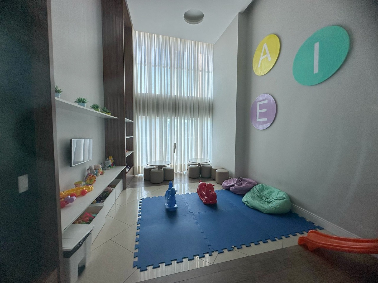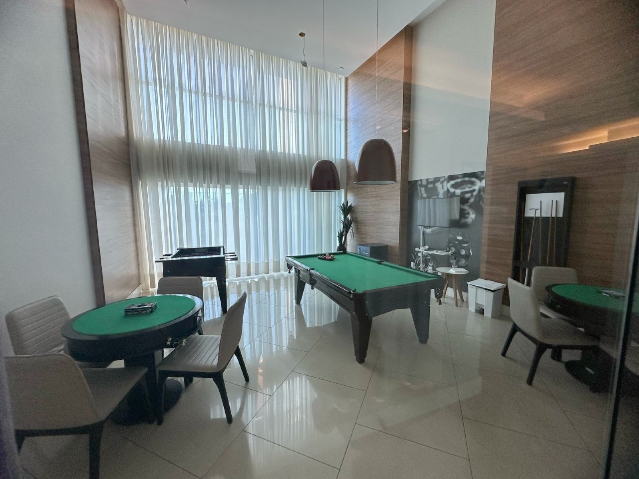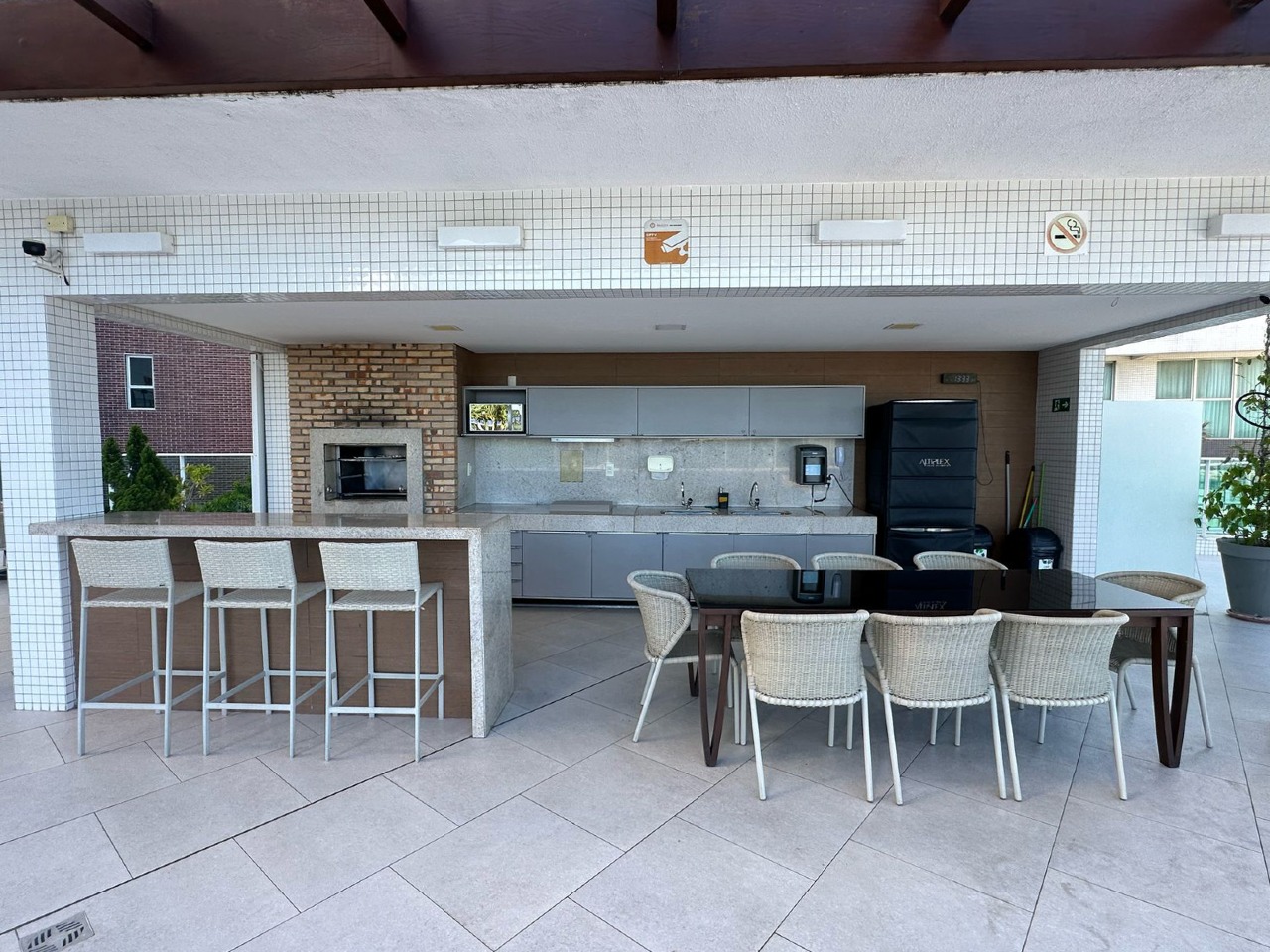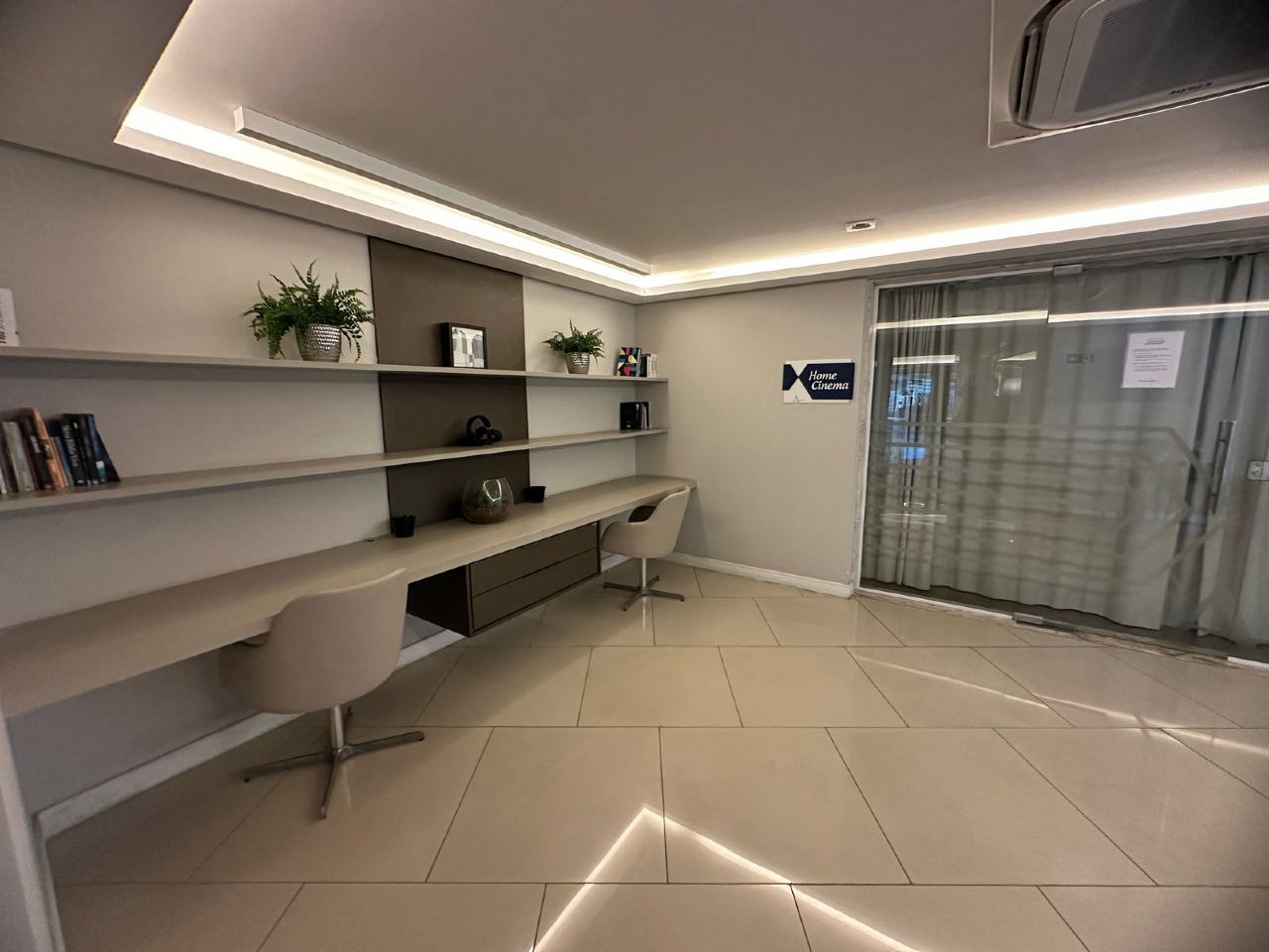 Esse apartamento possui sala para dois ambientes, varanda com vista mar, cozinha com área de serviço separada, banheiro social e dois quartos sendo um suíte. O empreendimento conta com piscina, salão de festas, academia, churrasqueira, cinema, playground, espaço gourmet, salão de jogos.