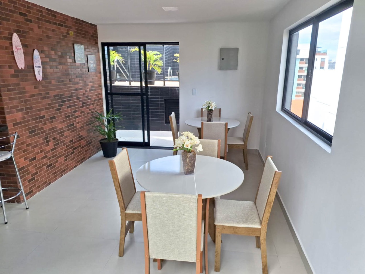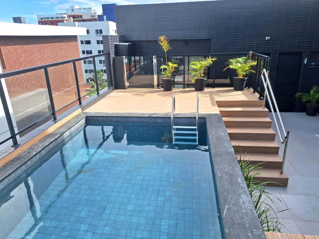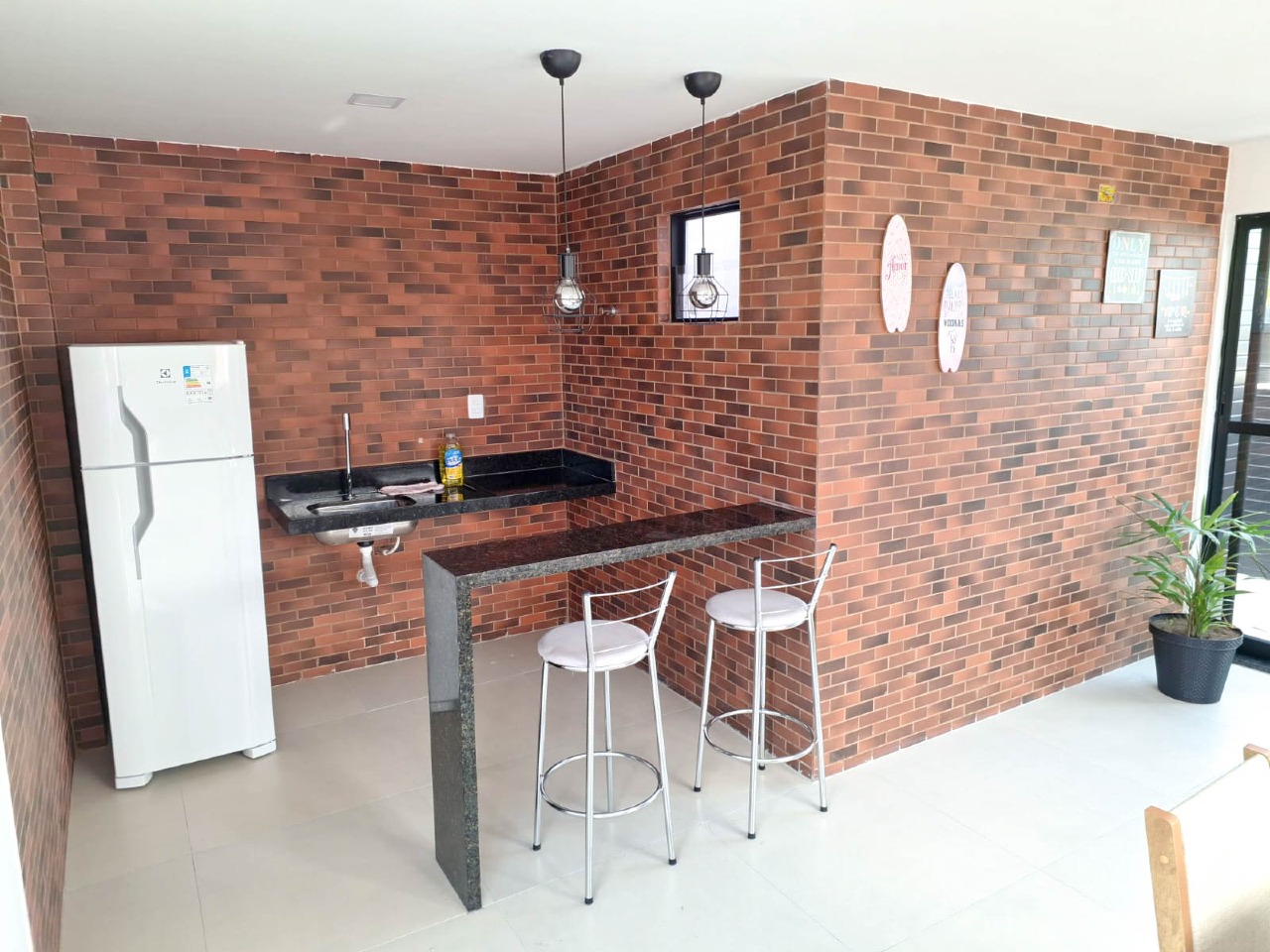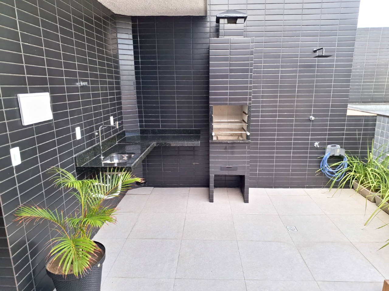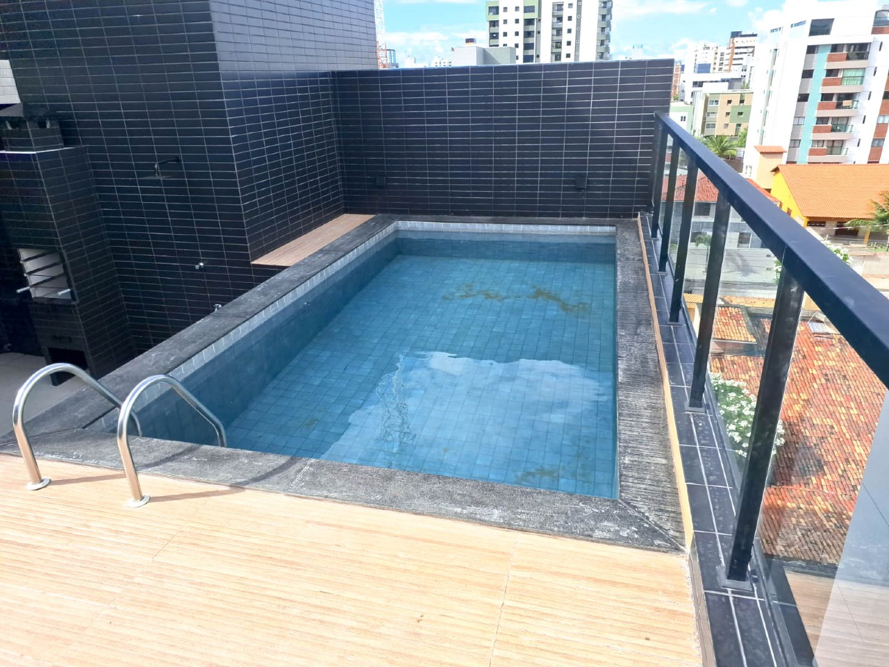 > Prédio com piscina, churrasqueira, lavanderia e salão de festas;