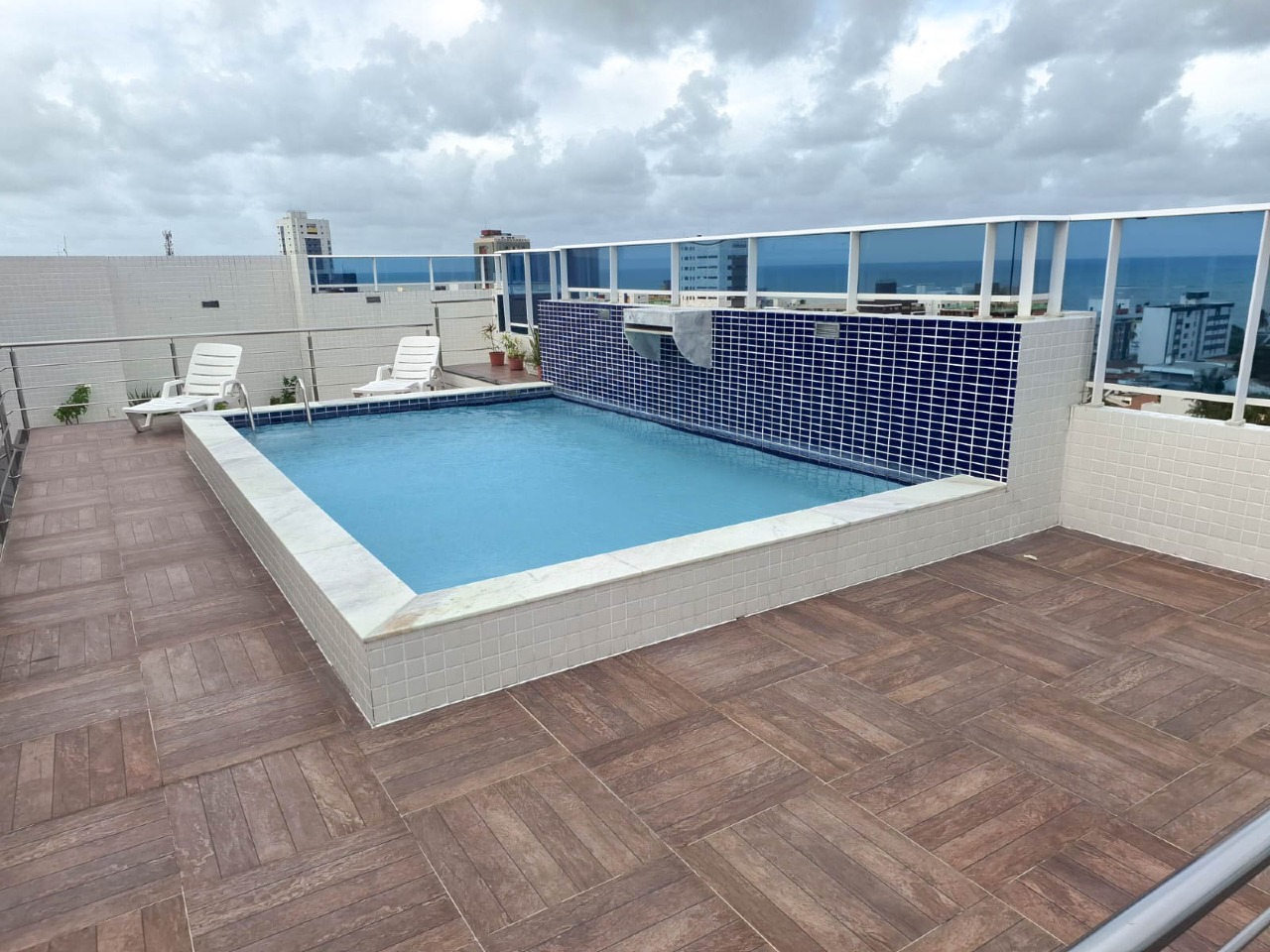 > Prédio com piscina, espaço gourmet e salão de festas;