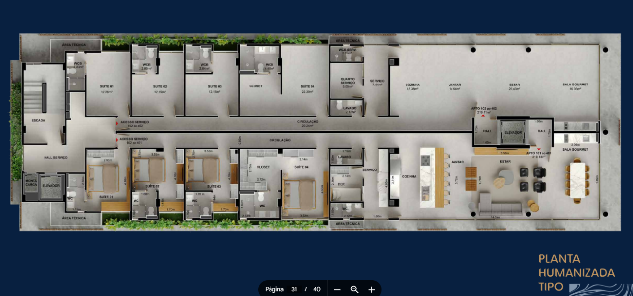 Com opções de plantas diferentes, sendo; Apartamentos com 219m² possuindo quatro quartos, todos suítes, banheiro social, sala de estar/jantar, cozinha com área de serviço integrada, DCE e sala gourmet.