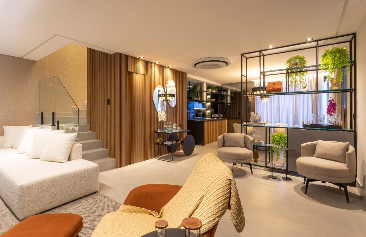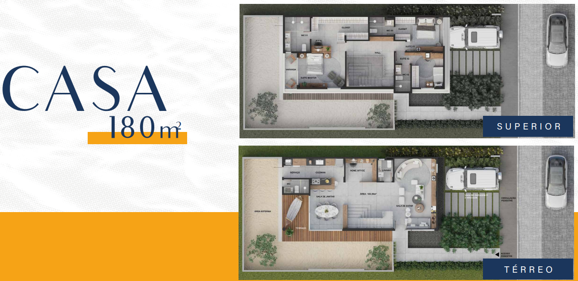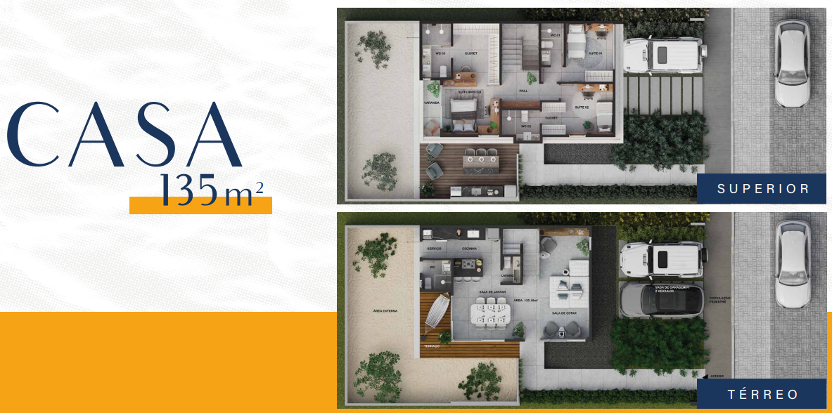 No primeiro pavimento: Uma harmoniosa combinação de sala de estar, sala de jantar e lavabo apresenta-se como o cenário perfeito para receber os visitantes. A cozinha com área de serviço integrada proporciona funcionalidade, enquanto o terraço e área privativa convidam ao relaxamento e lazer. Duas vagas de garagem agregam praticidade.
