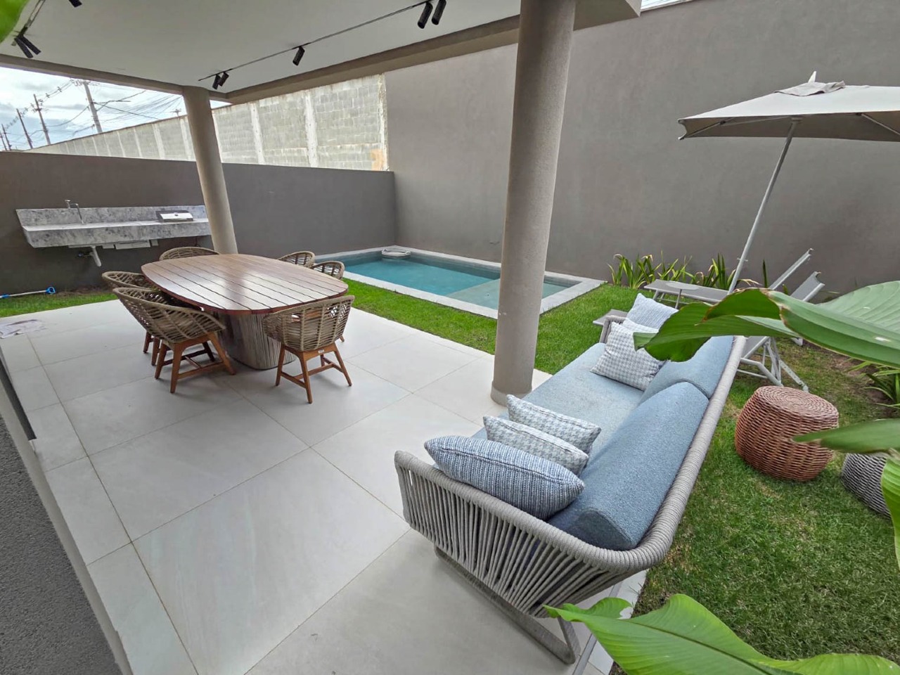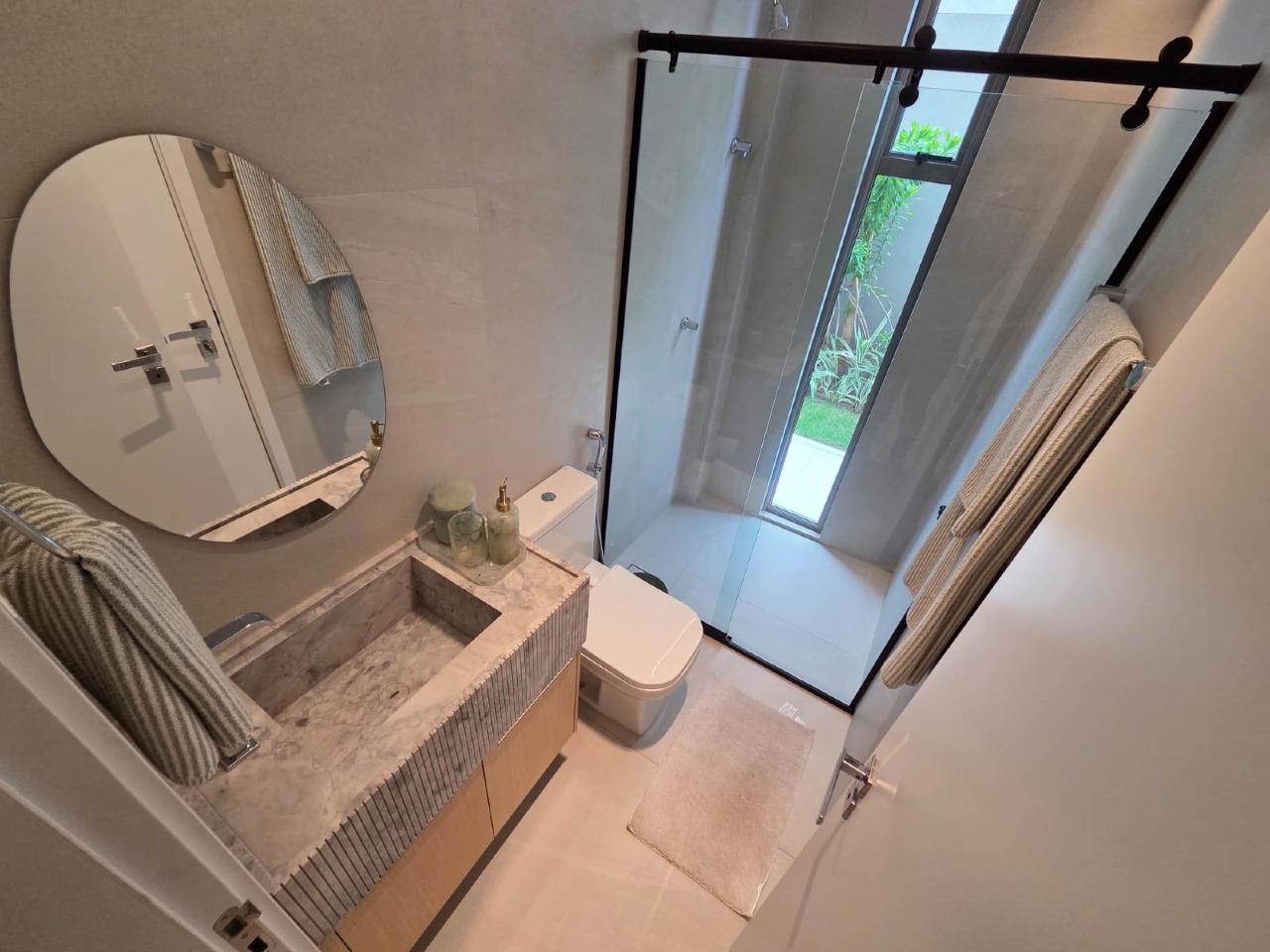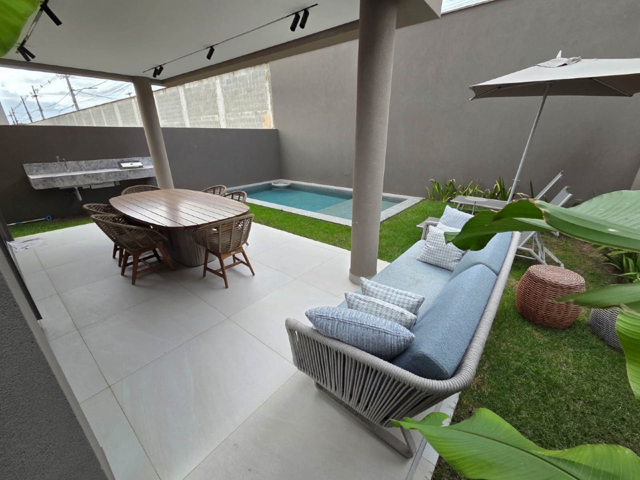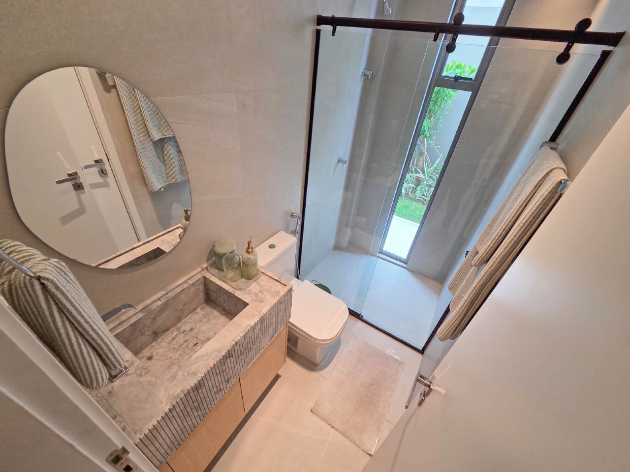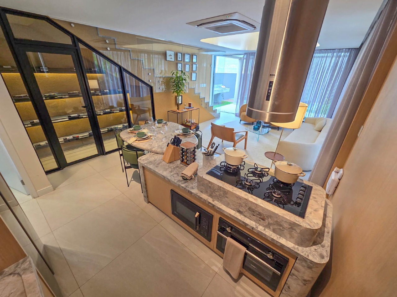 Casas de 270m² a 335m² possuindo dois pavimentos, no pavimento inferior temos a sala ampla para dois ambientes, lavabo, cozinha, área de serviço separada e área externa privativa. E no pavimento superior temos as quatro suítes.