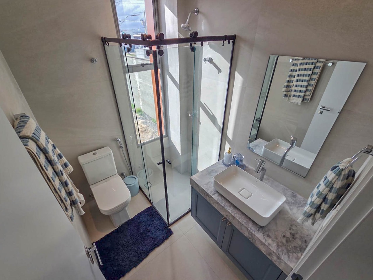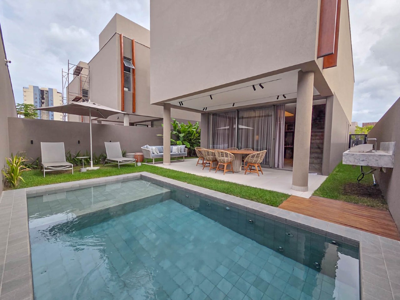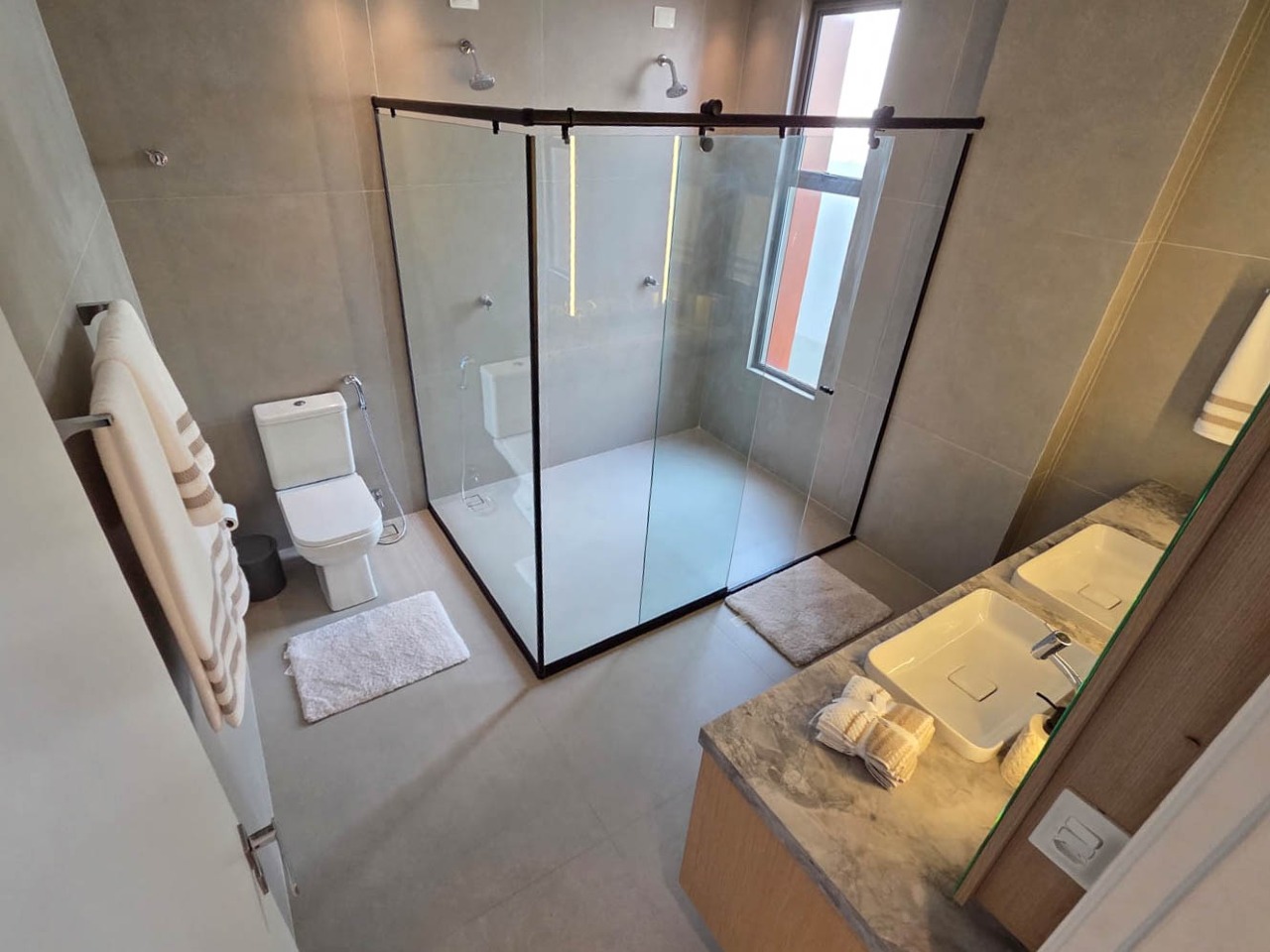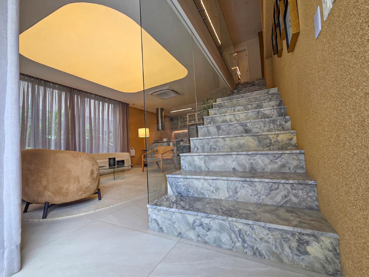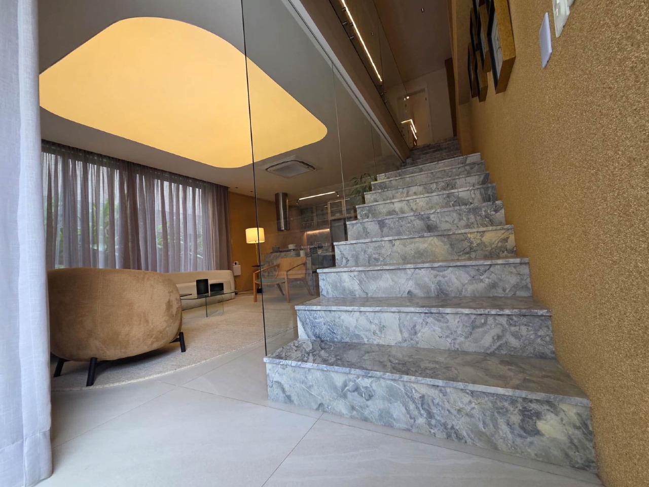 Casas de 270m² a 335m² possuindo dois pavimentos, no pavimento inferior temos a sala ampla para dois ambientes, lavabo, cozinha, área de serviço separada e área externa privativa. E no pavimento superior temos as quatro suítes.